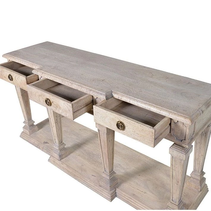 If the Roman empire and the Chateaux of Loire Valley had a furniture baby, we’re guessing it would look a little bit like this! The stunning columns give a colonial feel, whilst supporting the table making this item bold, solid and reliable. Finished with a distressed whitewash, no matter the colour of your interior; we’re certain this beauty will fit right in. With 3 drawers and adequate space at the base of the unit, decluttering just got a touch fancier!