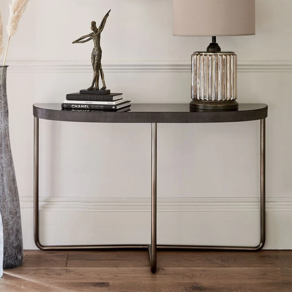 Add a gorgeous, contemporary aesthetic to your space with the beautiful Baron Console Table. Making the perfect addition to any hallway, this stylish console table comes in a half-moon shape with black tinted glass, giving this piece a glamorous yet modern flair.