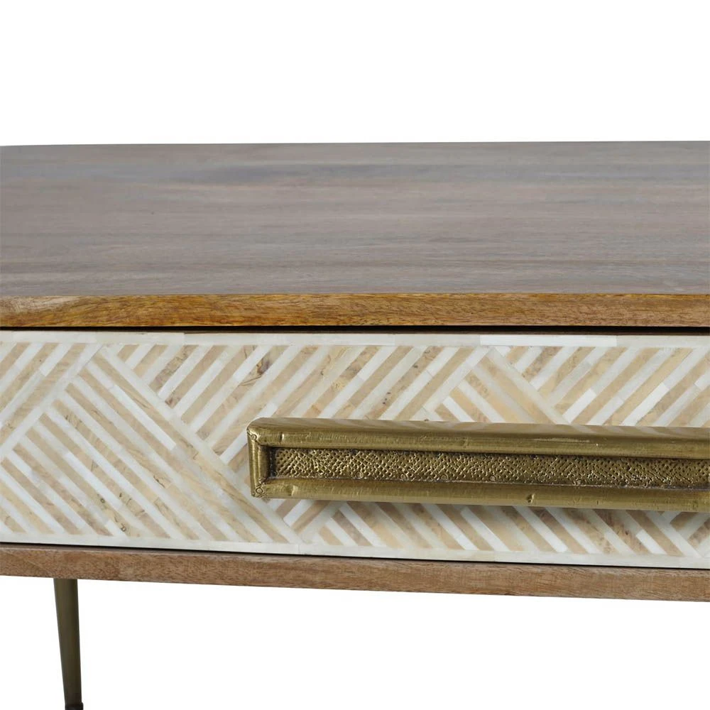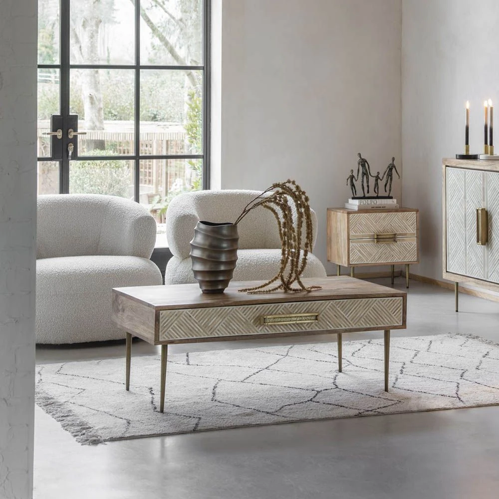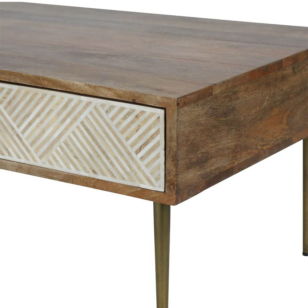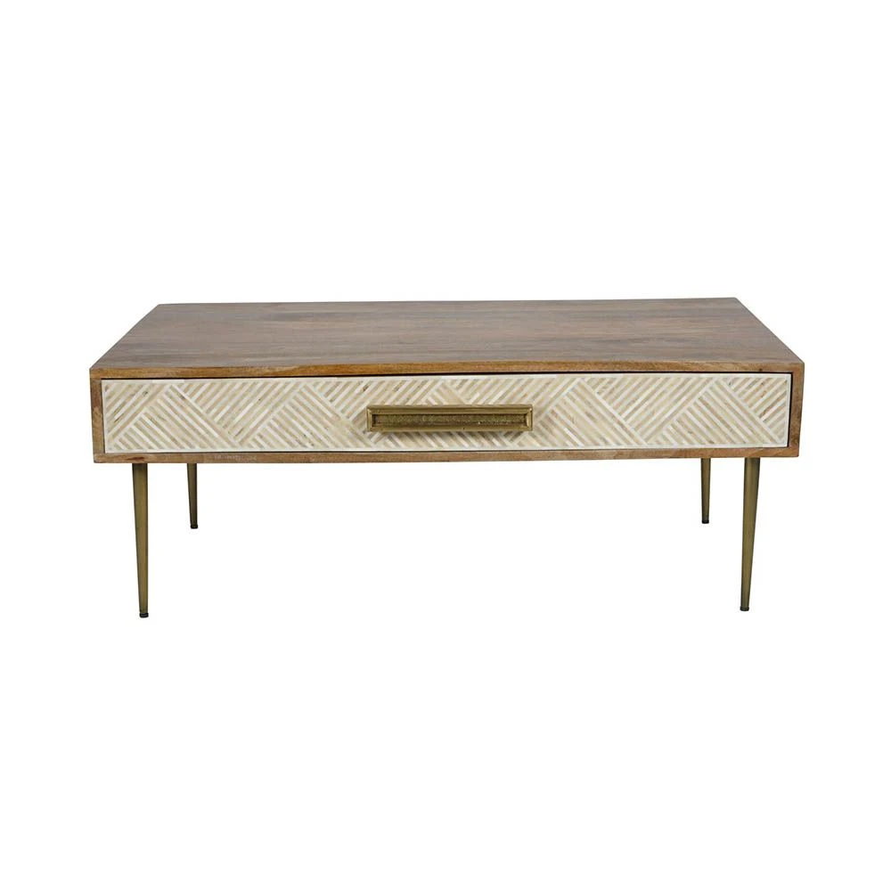 This stunning natural coffee table is crafted from Mango Wood and detailed with a patterned drawer made from bone and aged gold. The Beauvais Coffee Table is the perfect piece to store remotes and reading glasses to keep your space clean and convenient while decorating your space with natural charm and beauty.