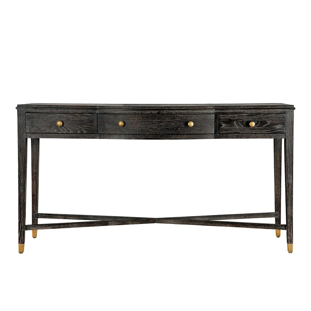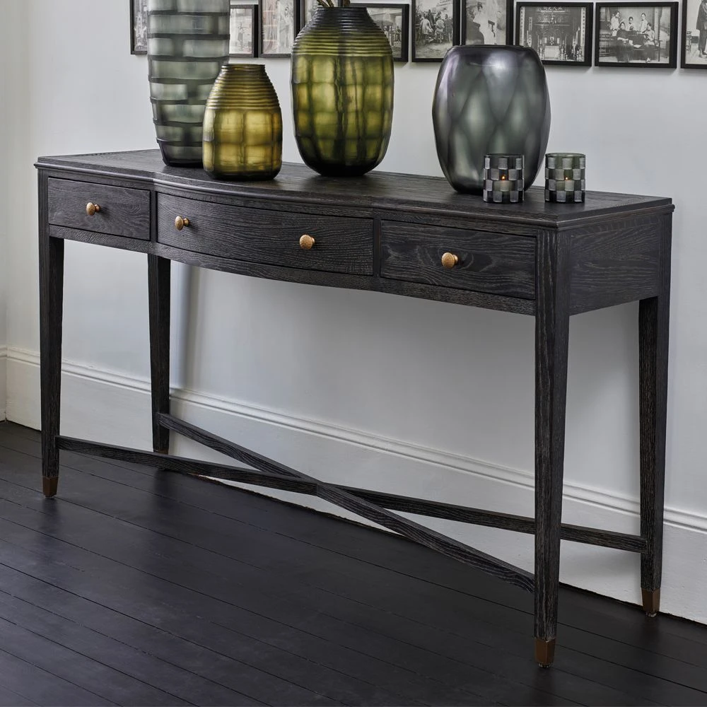 Introduce a timeless element to your modern living space with this gorgeous Ines Console Table. This elegantly stylish design comes in a rich, espresso tone with brass-effect accents. There are three drawers for storage and ample surface space for exhibiting your lush home accessories.