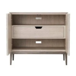 Punctuate your decor with the light rubber wood finish of this Lex Cabinet. This compact piece is a gorgeous addition to living room storage. With a narrow design and sliding doors, this piece is perfect for small spaces and will infuse your decor with a touch of Scandinavian elegance.