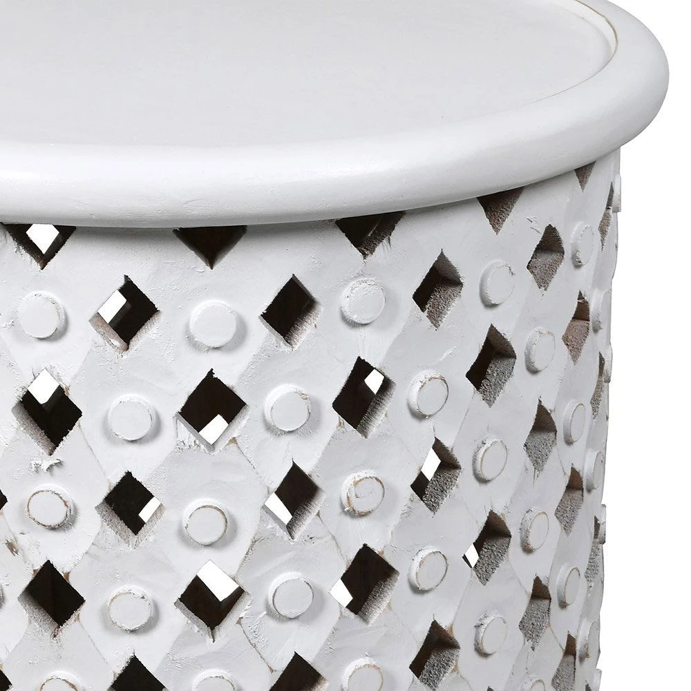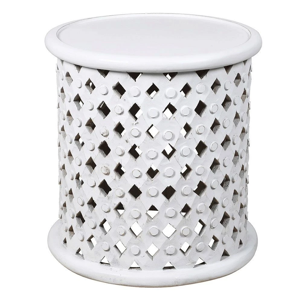 This Boston Side Table brings an industrial demureness to your living space, featuring a white criss-cross silhouette crafted out of Mango wood. With a circular top, the side table is set to become a staple furniture piece.