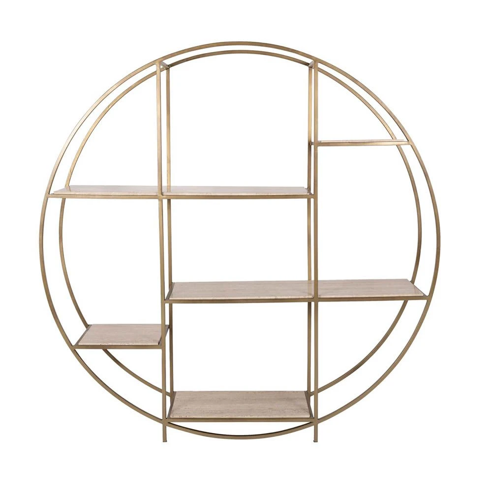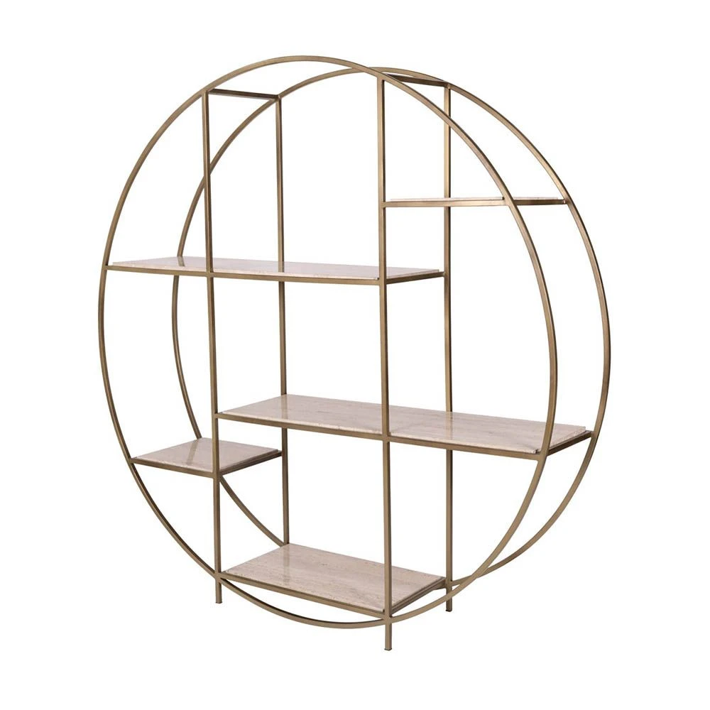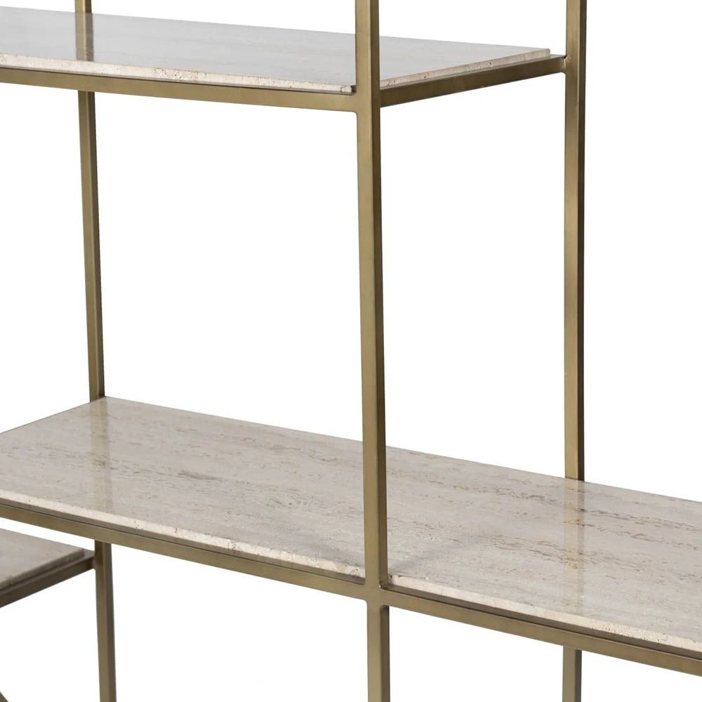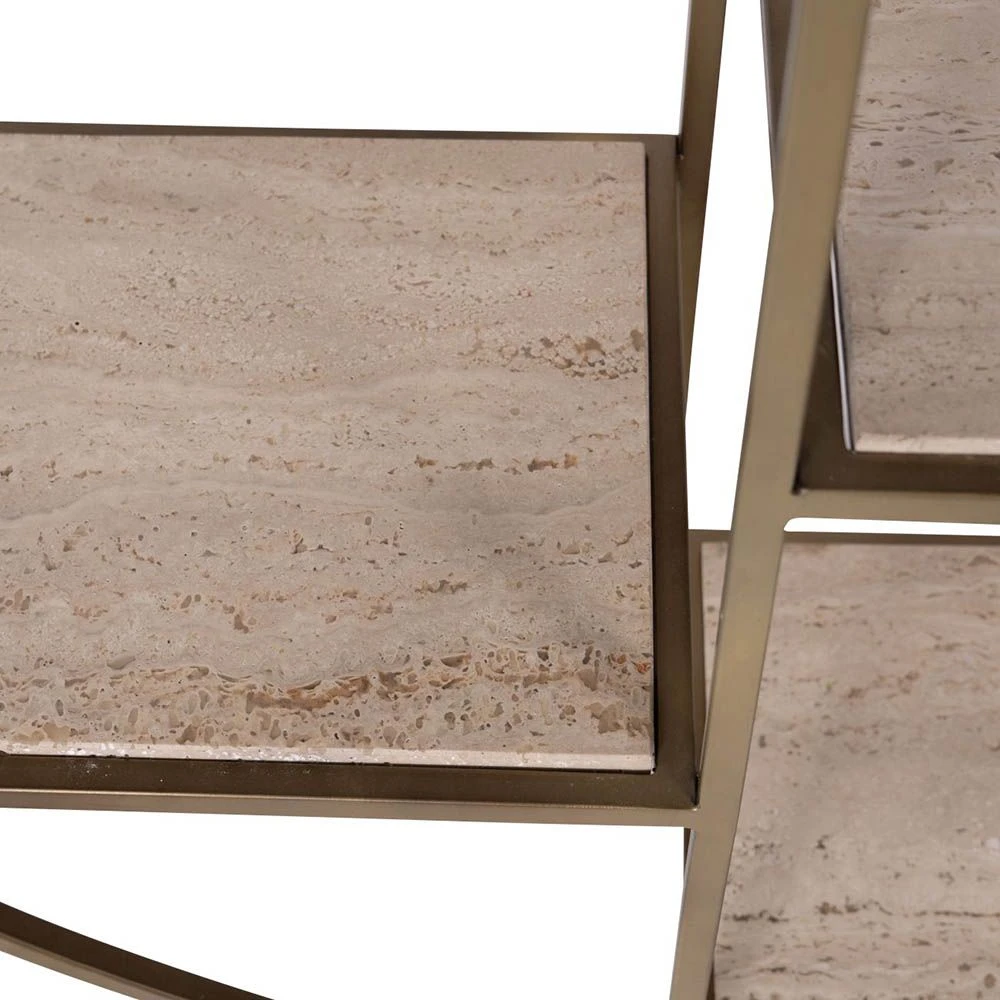 Dazzle with the exquisite Cadence Shelving Unit. The classy and elevated appeal of this piece comes from the natural hues of the limestone shelves that harmoniously complement the matte gold metal base, creating a chic, timeless look.