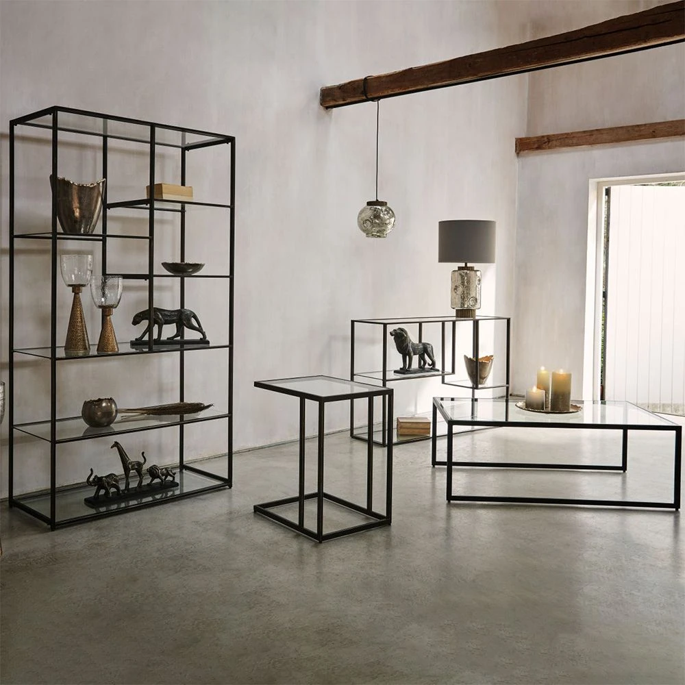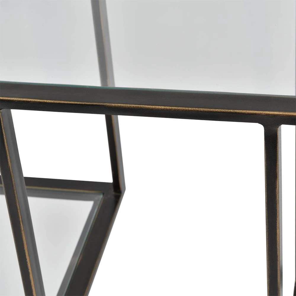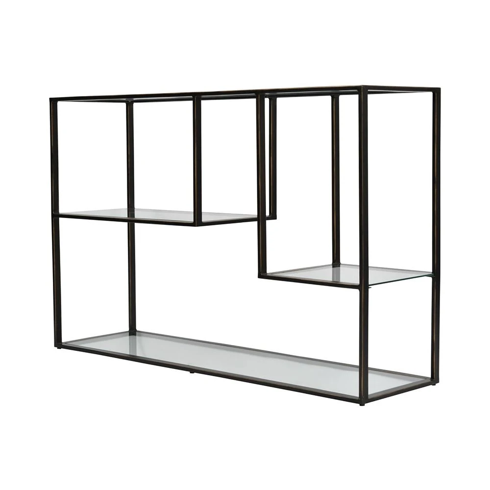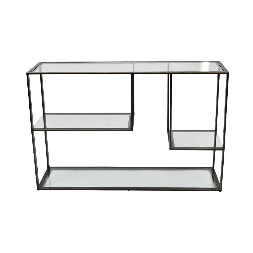 The chic and contemporary Camille Console Table is a modern statement piece with a distinctive design that will create a lovely display in your living room, dining room, hallway or entryway. This bold and sophisticated console features differing shelf heights that are ideal for displaying all of your decorative objects and create a unique sense of floating. This sleek console is finished with a dark bronze metal frame and a thin golden highlighted edge that will look perfect in any interior.