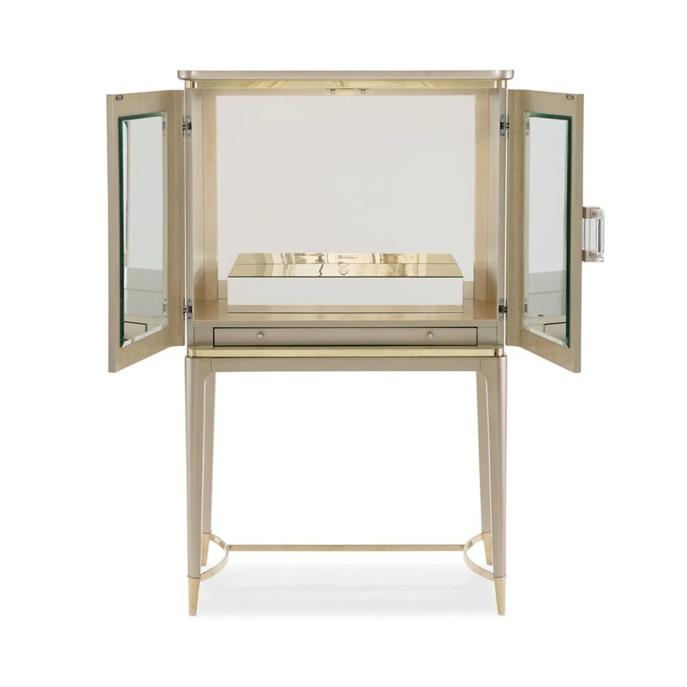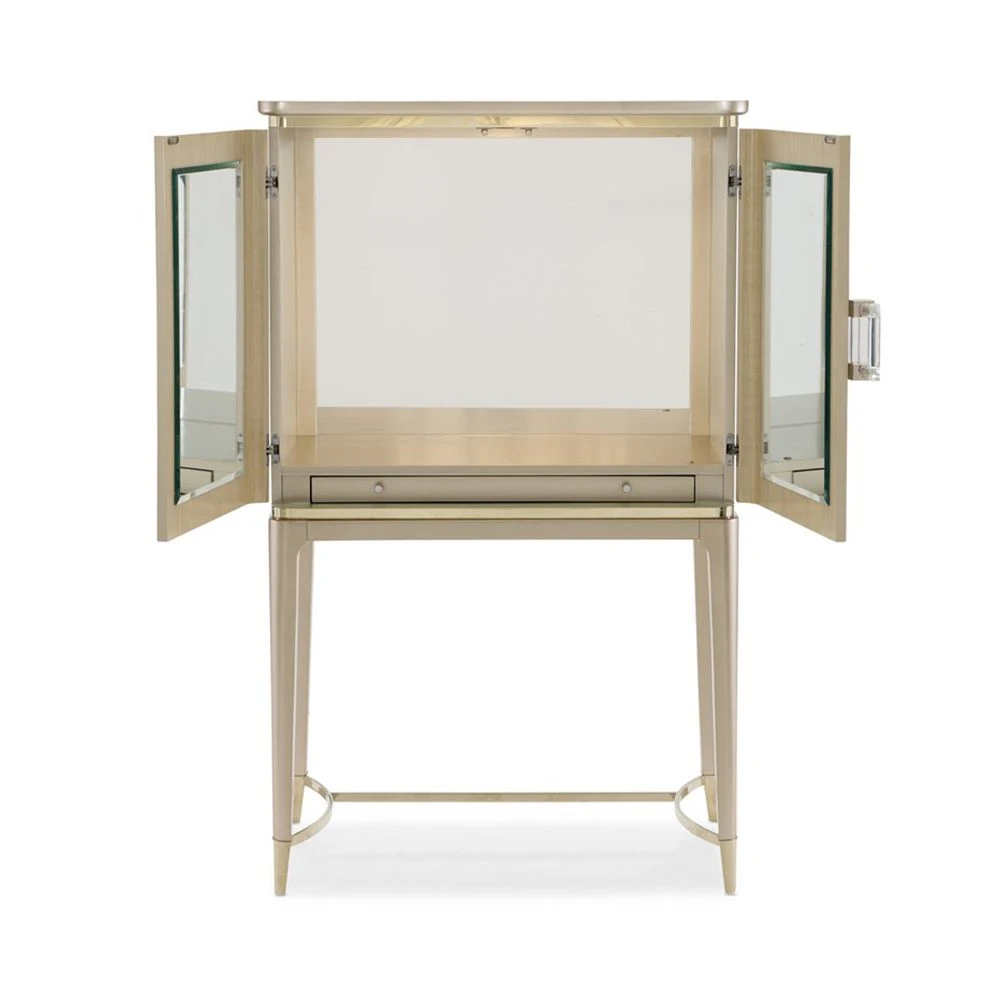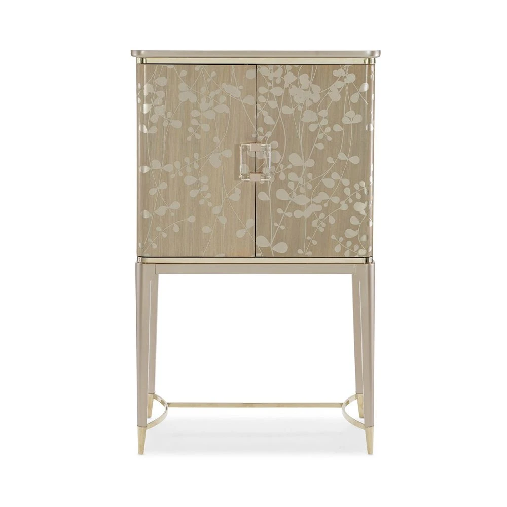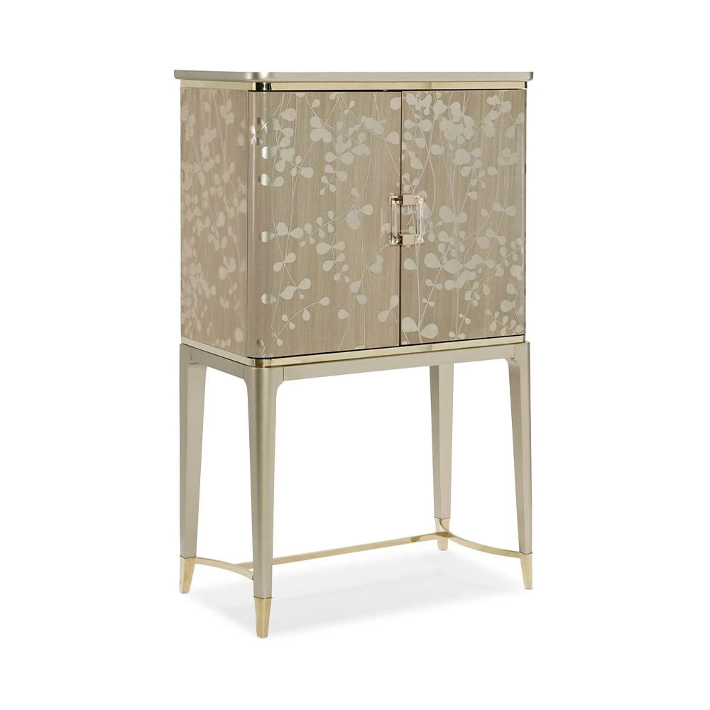 Enrich your home décor with the delicate, nature-inspired design of this luxury Leaf Bar Cabinet. The leaf motif embellishments are featured in a glimmering taupe finish that sits beautifully complimented by the champagne shade of the wooden doors. With an exquisite mirrored interior that holds a pull-out tray and a removable serving box, this piece is guaranteed to be at the centre of your social gatherings.