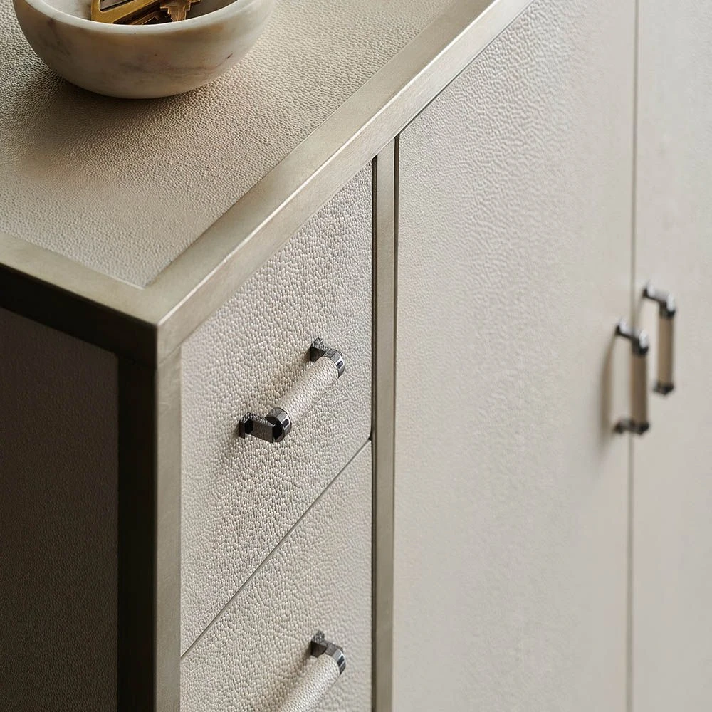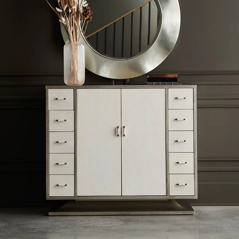 With its Art Deco flair, this stunning cabinet boasts a wealth of storage behind two softly-closing doors with European hinges, along with ten petite drawers for organizing all your essentials. The classic, vintage-inspired look is achieved with faux shagreen wrapping that gives it the appearance of having been collected over time, while a wood base and trim in a smoky charcoal finish adds a touch of sophistication. Inside, you’ll find a stylish matte pearl-painted interior and chic metal pulls…