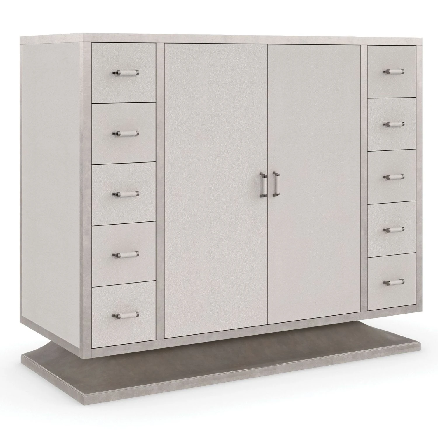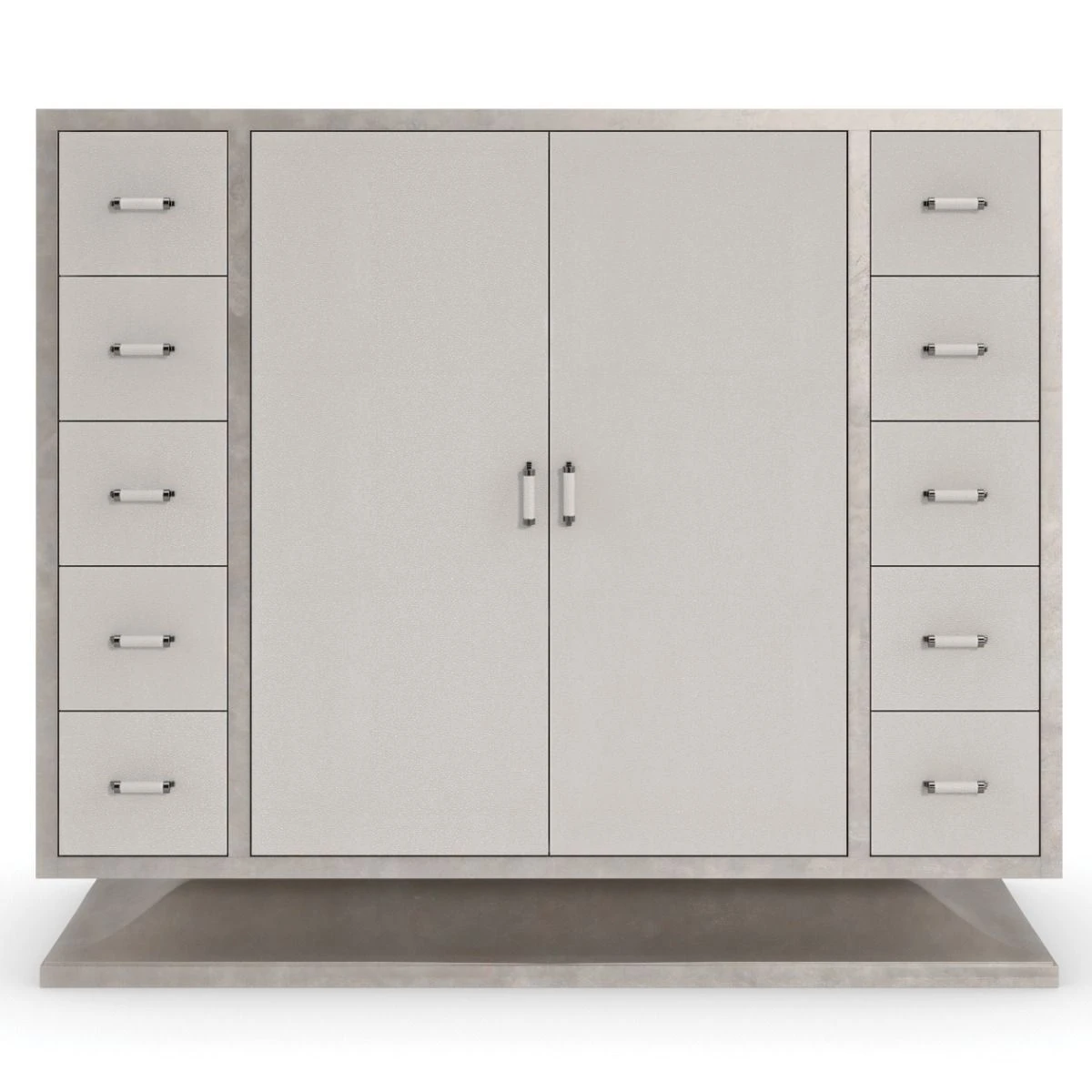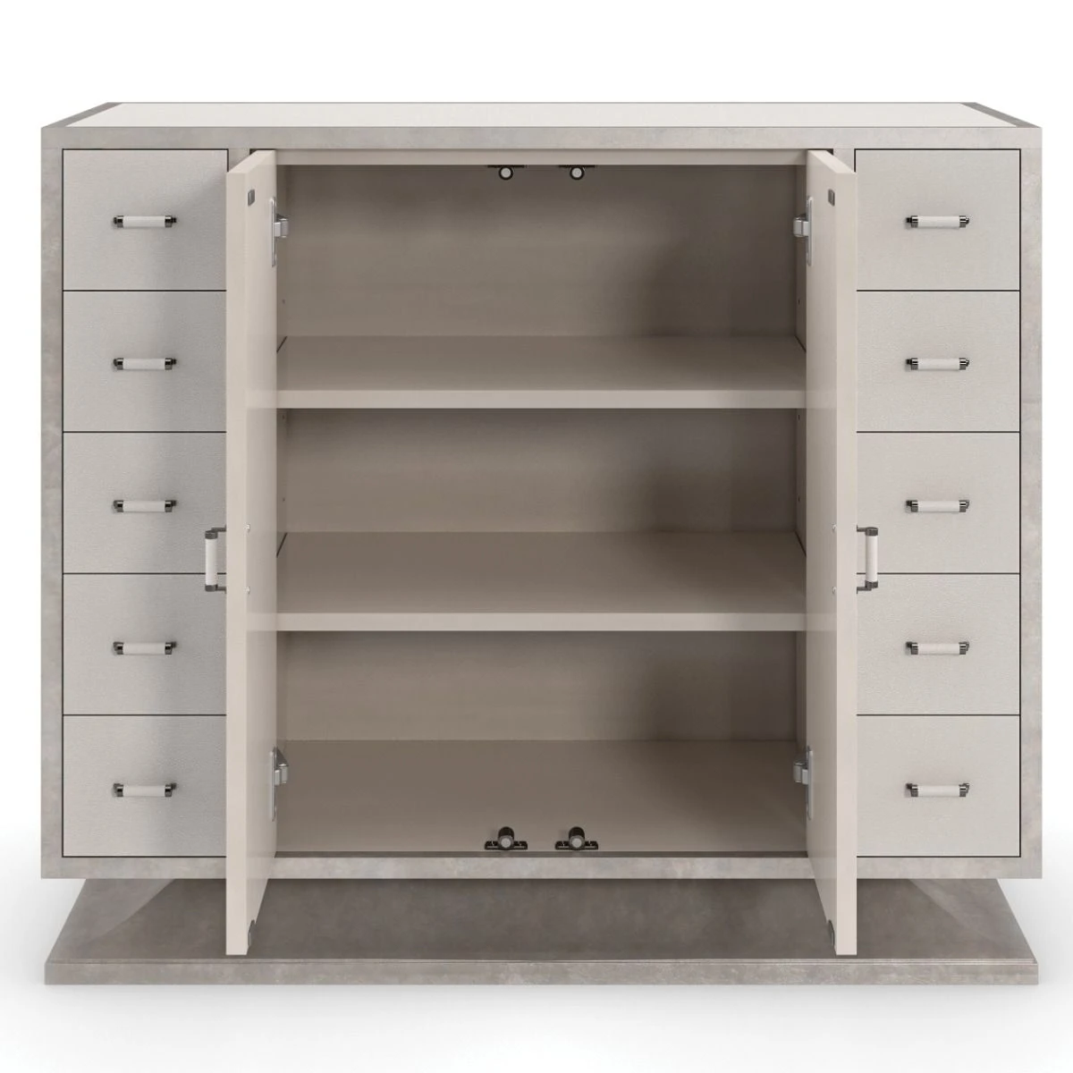 | Construction | Case in wrapped in faux Shagreen. Wood trim and base in Charcoal Leaf. Two doors with soft close European hinges. Center interior features two adjustable shelves. Ten side drawers with wood guides and runners. Metal hardware in Deep Bronze wrapped in faux |