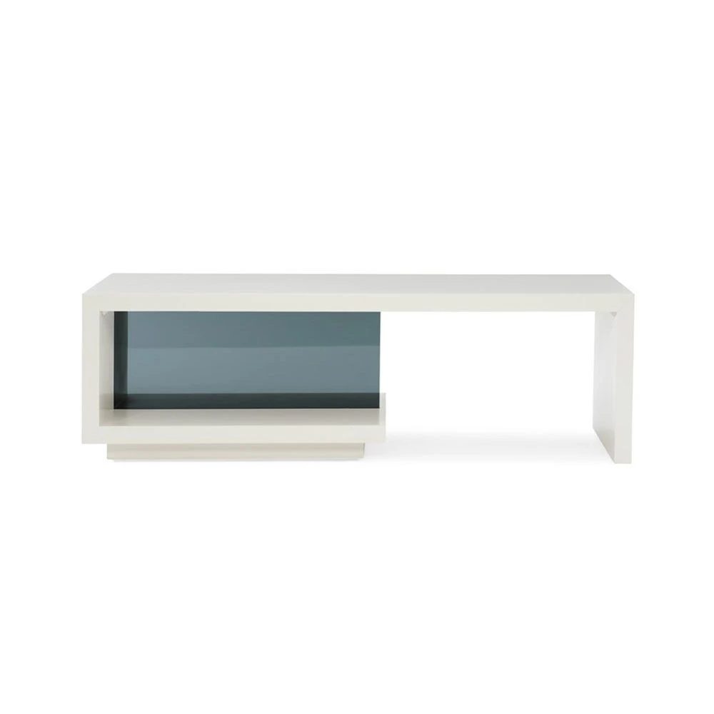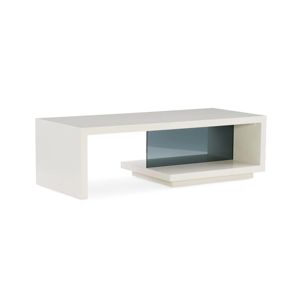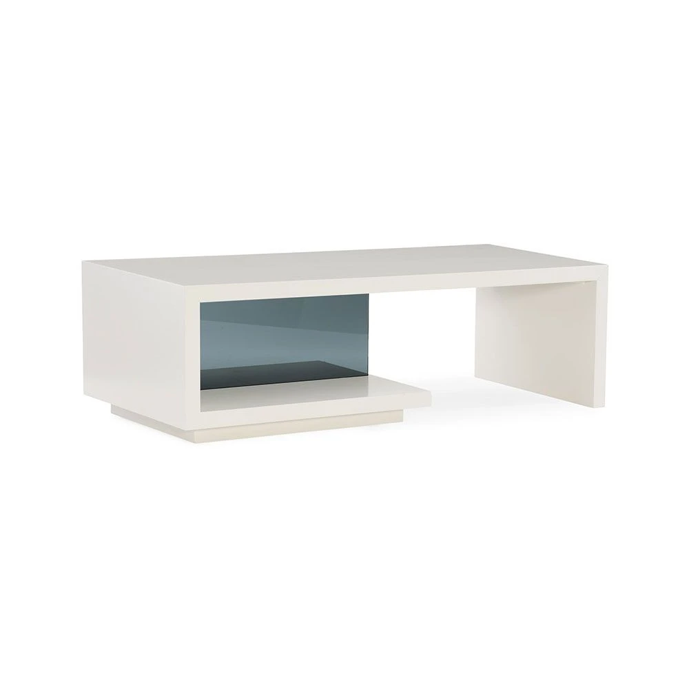 Anchor your living area with the sculptural and stylish, Expressions Cocktail Table. Bold and beautiful in form and perspective, this contemporary cocktail table boasts a white finish complemented by a signature shape with a smoked, grey glass insert panel. It’s open area provides an abundance of room for storage and decorative pieces while its plinth base completes its modern appeal.