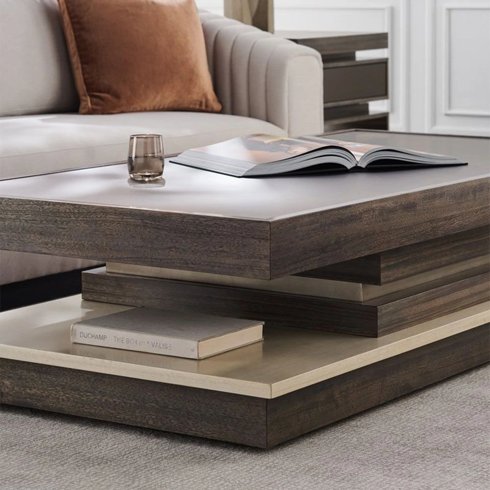 Punctuate your living area with the beauty and functionality of this modern cocktail table by Caracole. This tasteful, tiered table combines sophisticated design and structured architecture to produce this stylish statement piece. Stacked slabs boast a mix of materials and finishes including a frosted bronze glass top. Let the opulence of this charming cocktail table redefine your home.