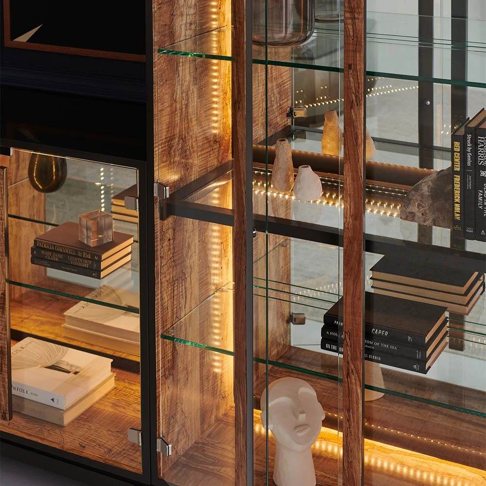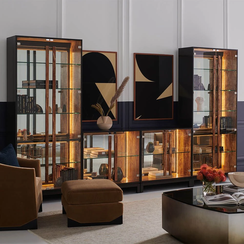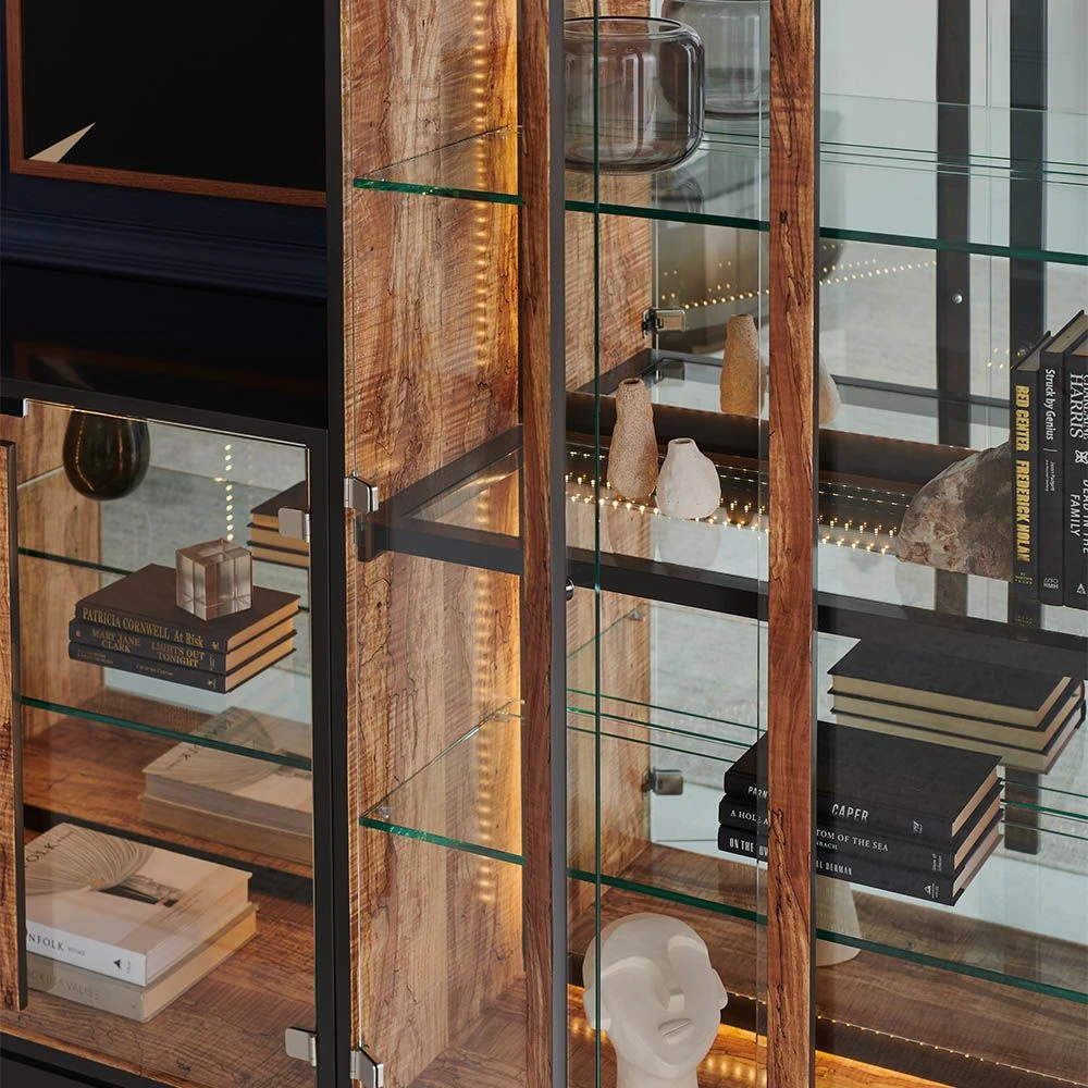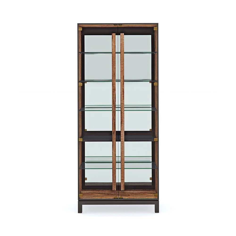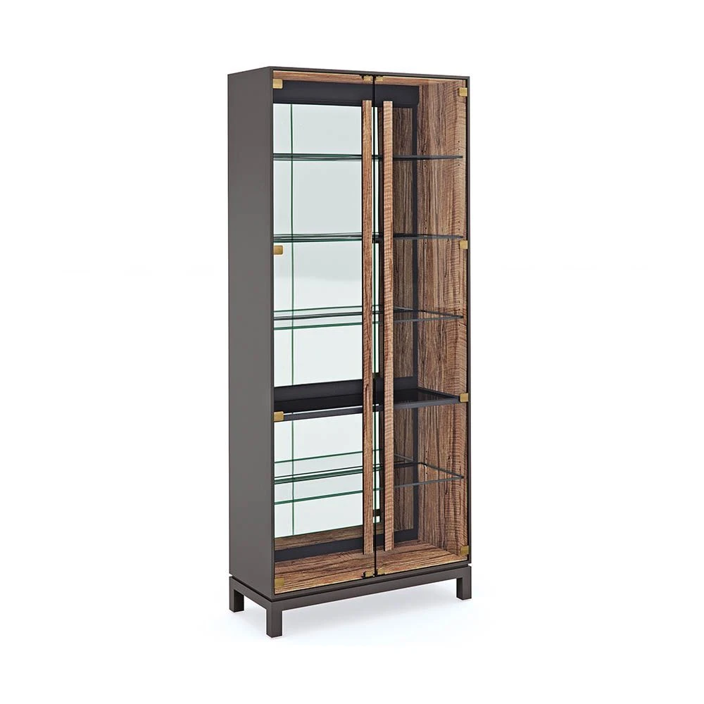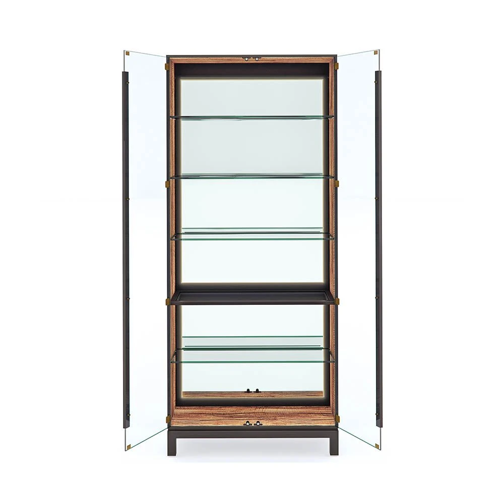 Integrating striking modern design with natural materials, this majestic cabinet is the perfect place to exhibit your stunning trinkets and curios. This illuminated cabinet is elevated by its complex mix of dark brown, black, and olive tones and sleek mirrored back and glass doors and shelves, all of which create an utterly captivating beauty.