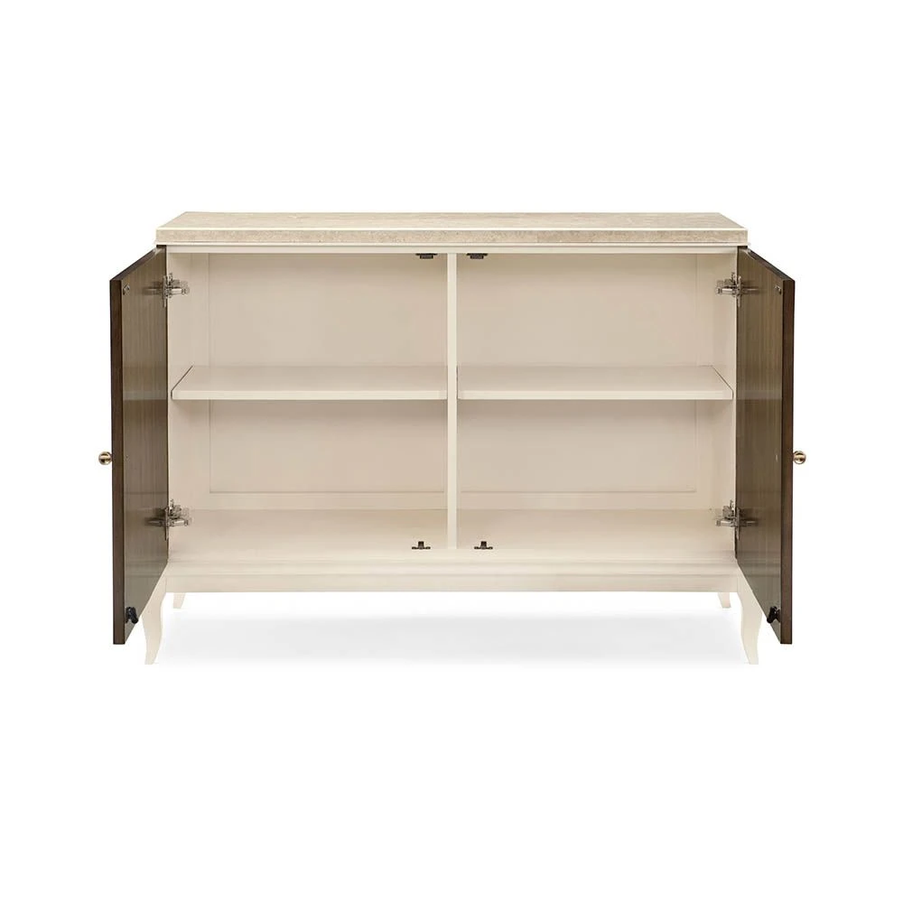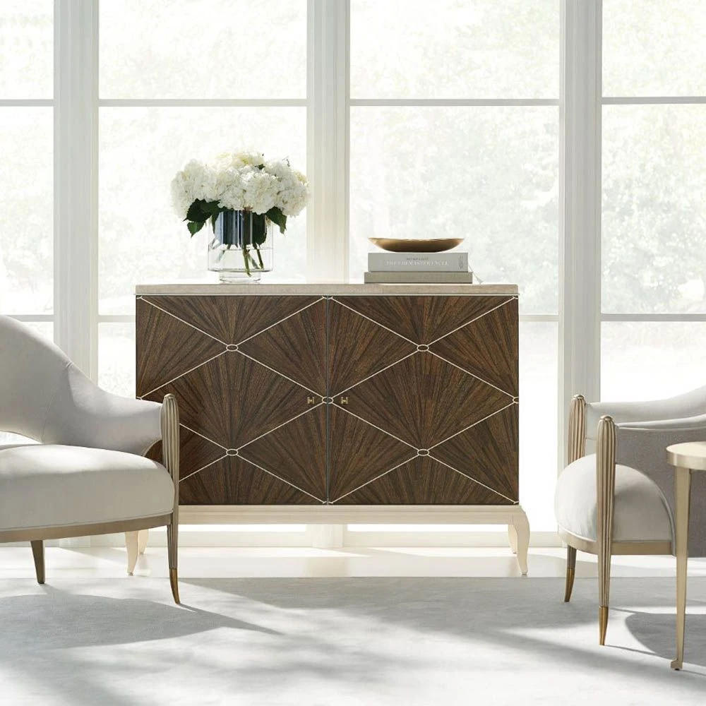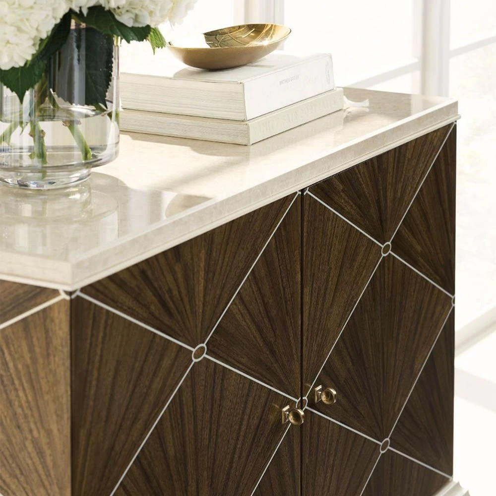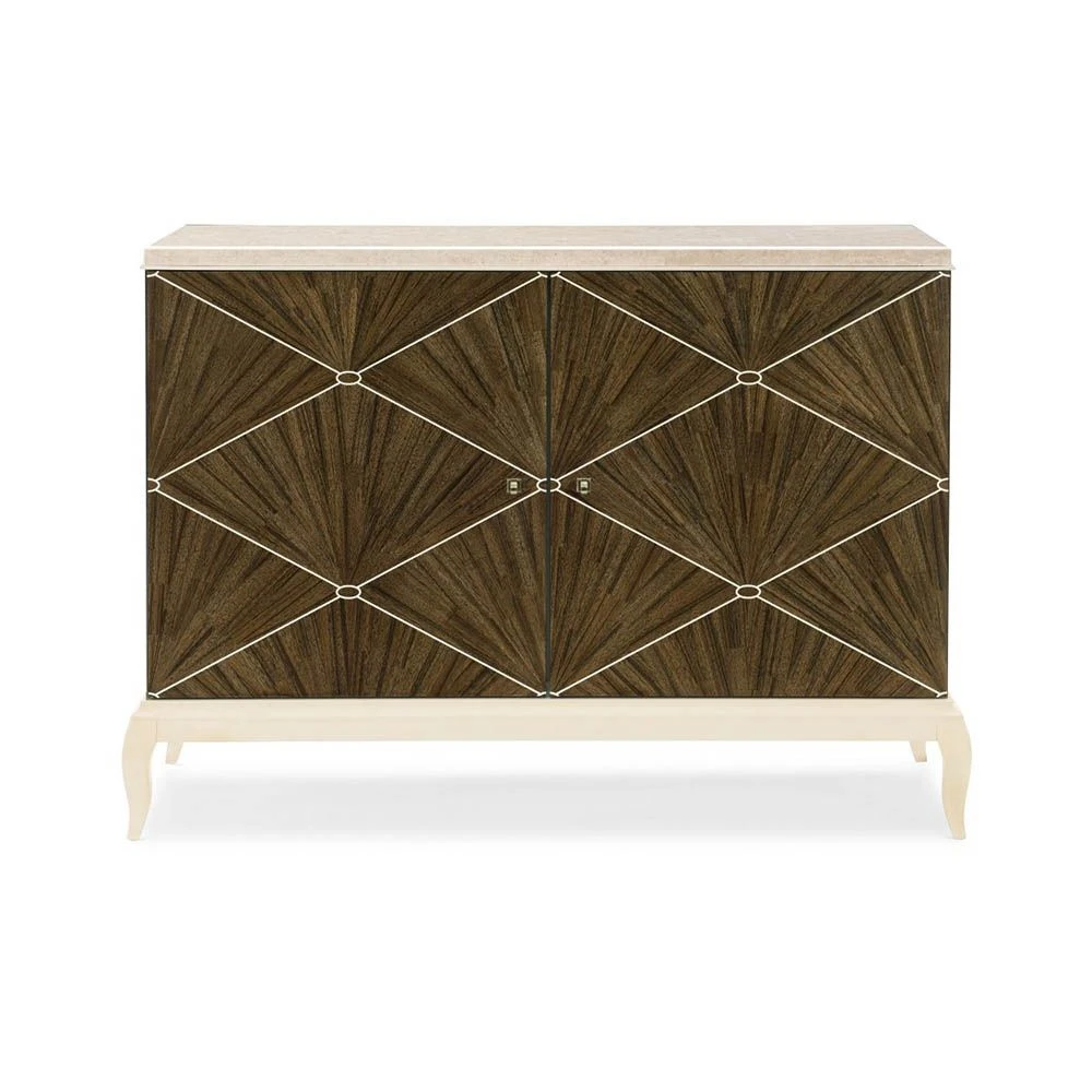 For connoisseurs of art deco inspired beauty and for lovers of exceptional design, this dazzling cabinet is a must-have. The embellished doors give this piece a touch of the dramatic while the elegant, polished marble top completes the sophisticated look. Adore the livable luxury that this cabinet will bring to your home decor.