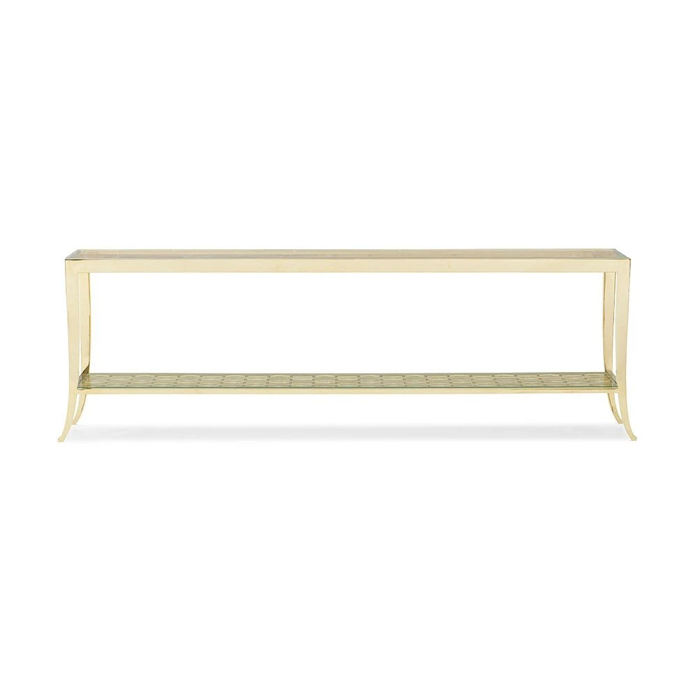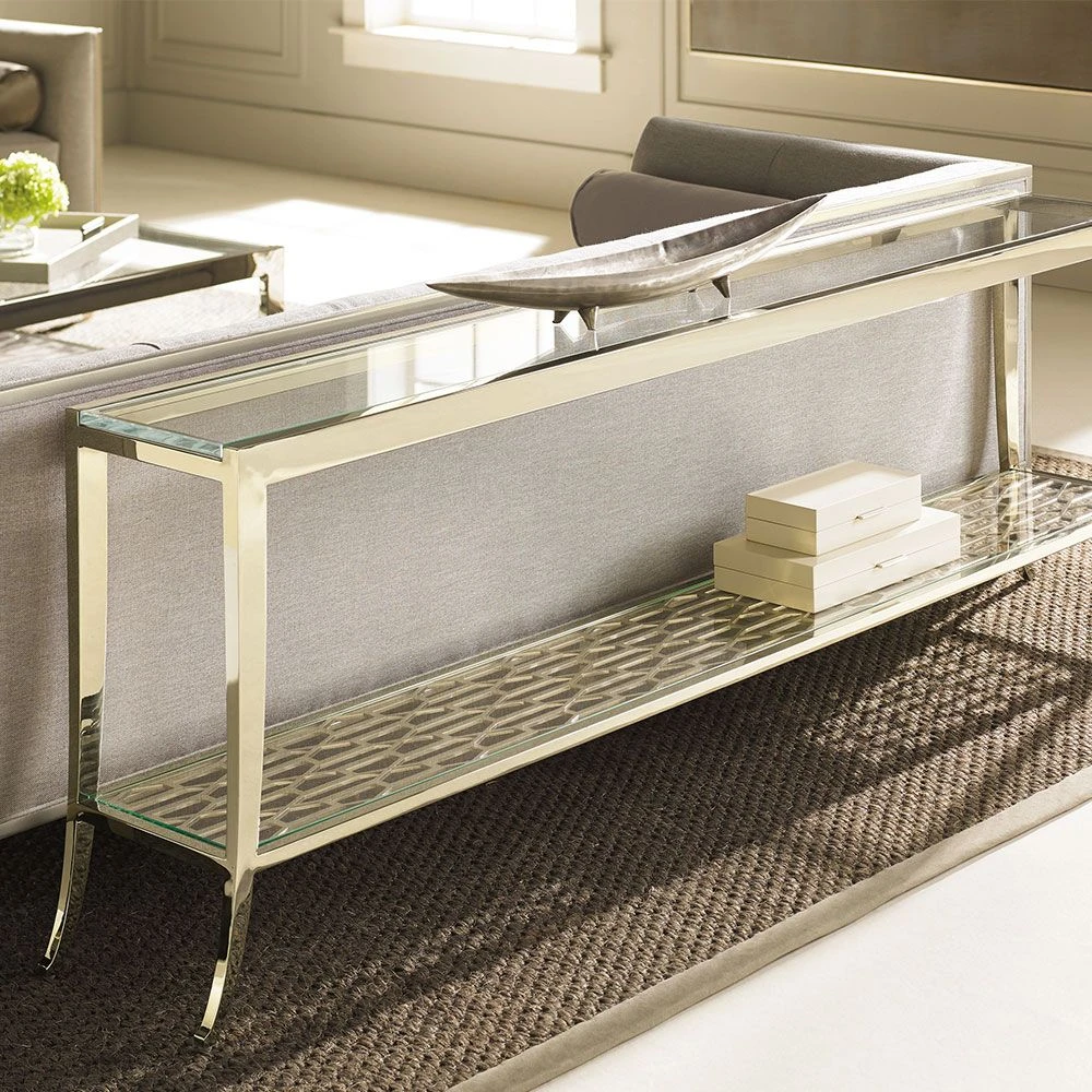 A dreamy addition to the Holding collection from Caracole, this console table oozes contemporary glamour and panache. With the geometric patterned metal frame beneath the lower shelf, this piece is a stunning addition to a variety of interior styles. The tempered glass top offers an element of sophistication that will brighten up any room.