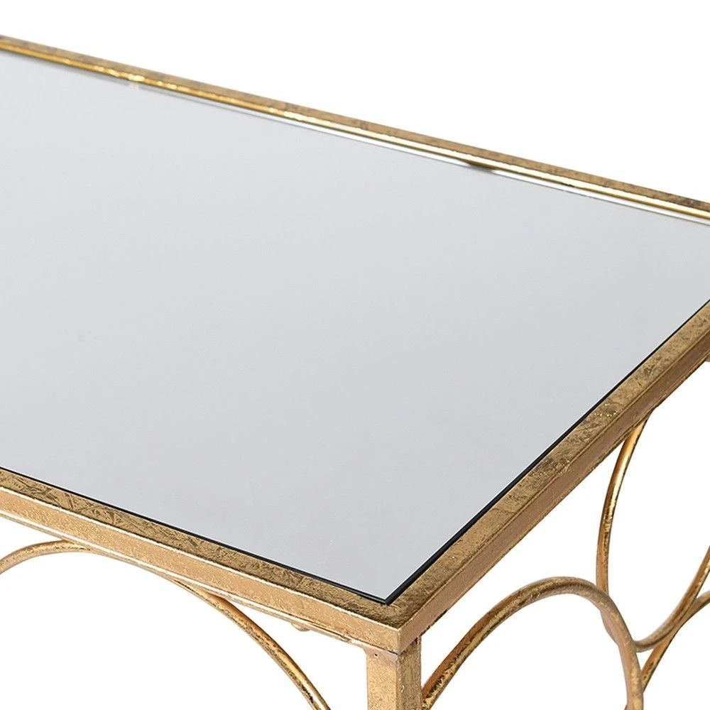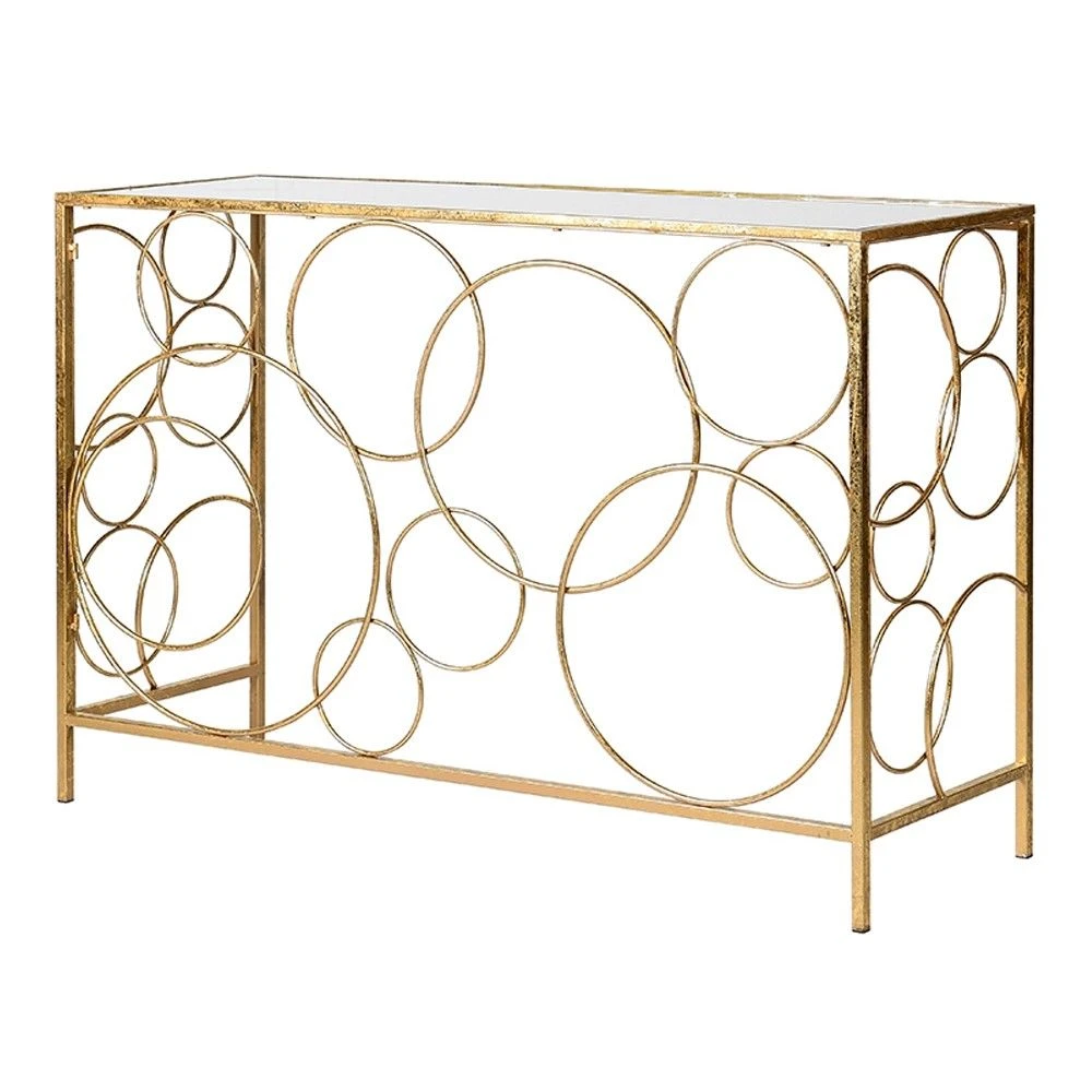 This gorgeous console table is just what you need to add some character and depth to your living spaces. The console is formed of iron with a luxurious, polished gold finish and features several circular loops around the base of the unit. The tabletop is clear glass, offering a polished and unique finish to this already stunning table!