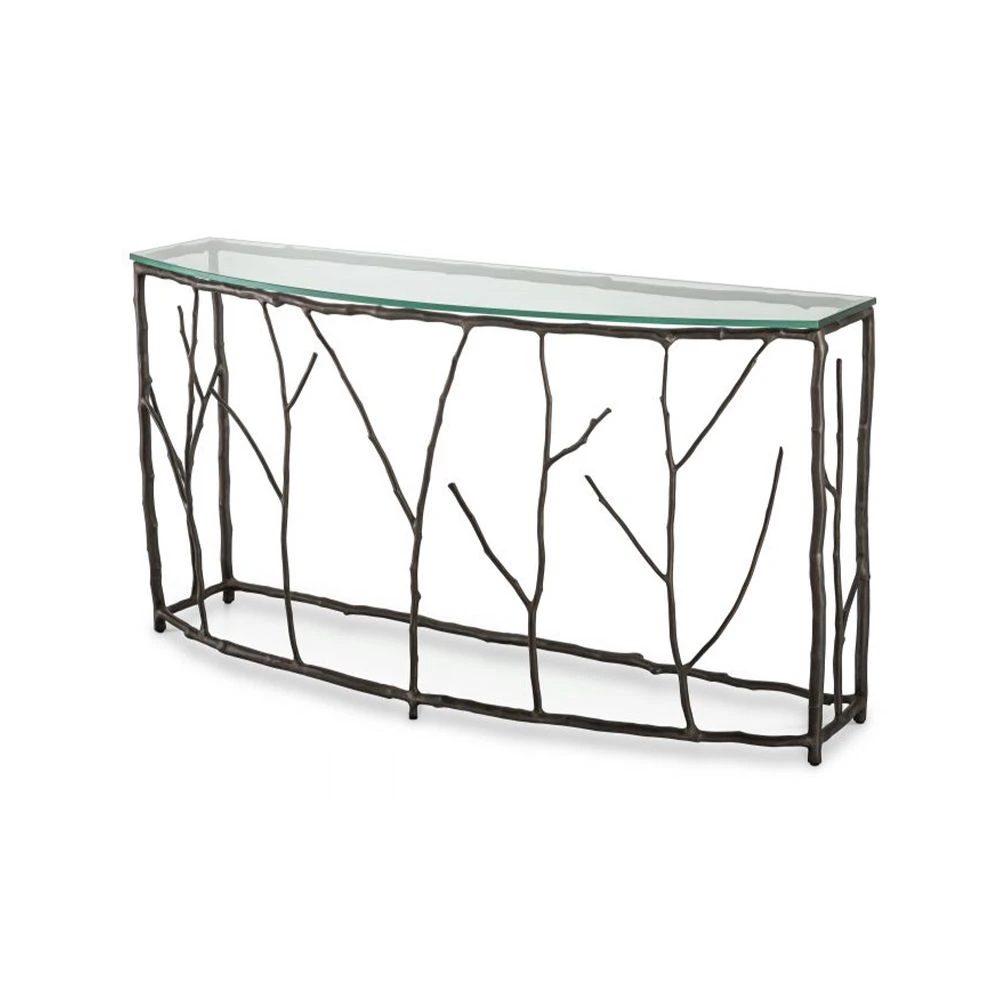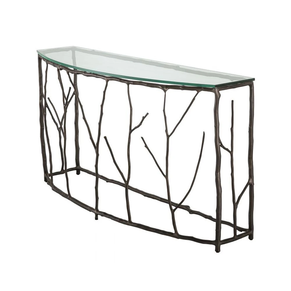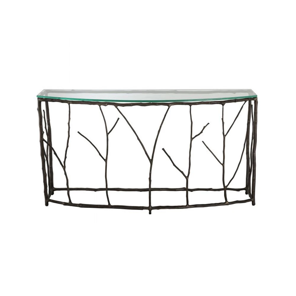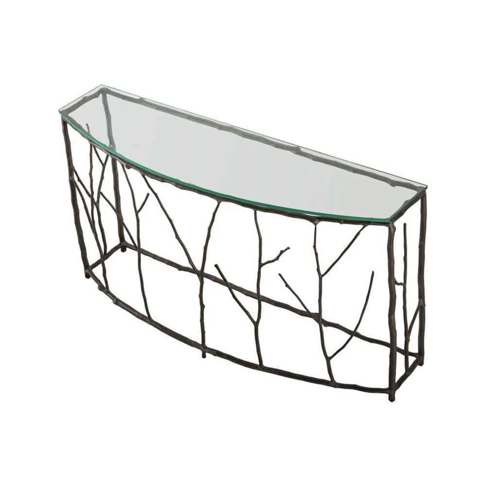 Make a stunning statement in your living space with the luxury Antico Console Table. This distinctive piece features a beautiful branch-like frame with a lovely bronze finish and semi-circular clear glass top. This chic console table is perfect for showcasing all of your luxury home accessories and fabulous flower arrangements.