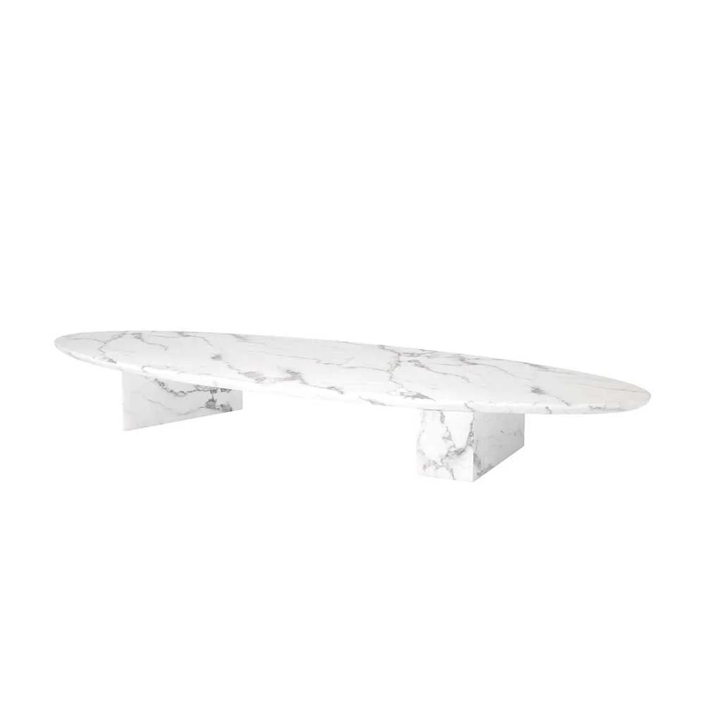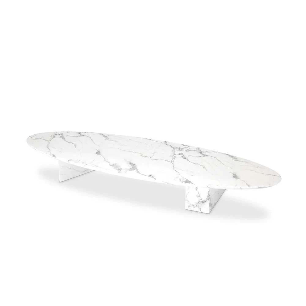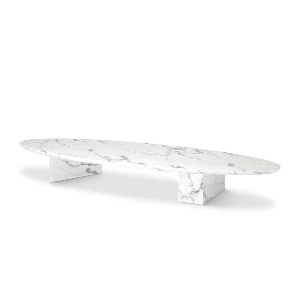 Give a glamorous touch to your living room décor with Aurore Coffee Table by Eichholtz. Made of white faux marble, this chic coffee table will fit with any style and colour scheme. Its elegant oval table top rests on two sturdy triangular-shaped blocks.