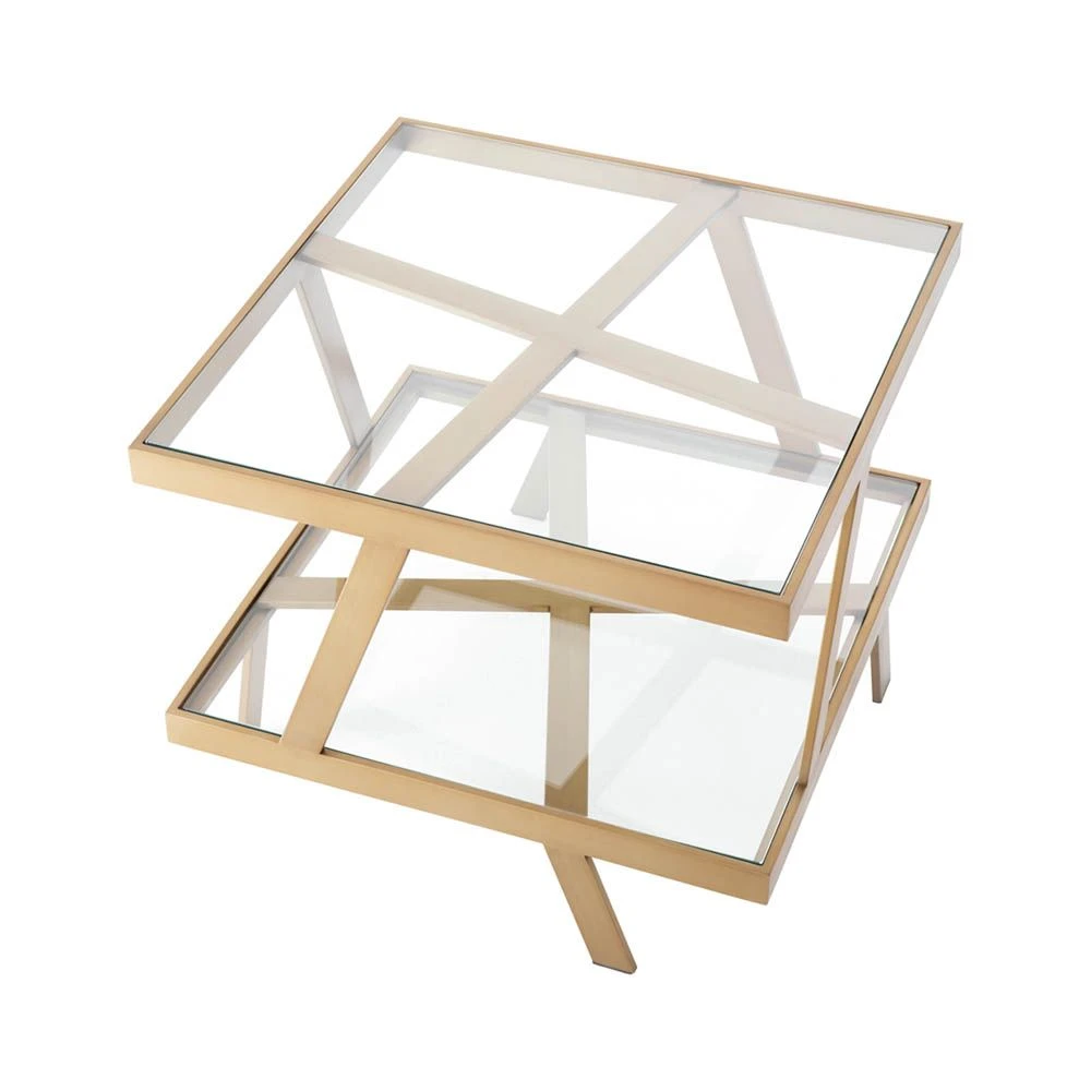The Billinghurst Side Table is a design masterpiece with its brushed brass finish and captivating frame design. With its clear glass tops, this side table not only offers a practical surface but also showcases the artistic frame within, creating a stunning visual effect. The side table is a sophisticated and eye-catching addition to any living space, combining functionality with artistic charm in one remarkable piece.