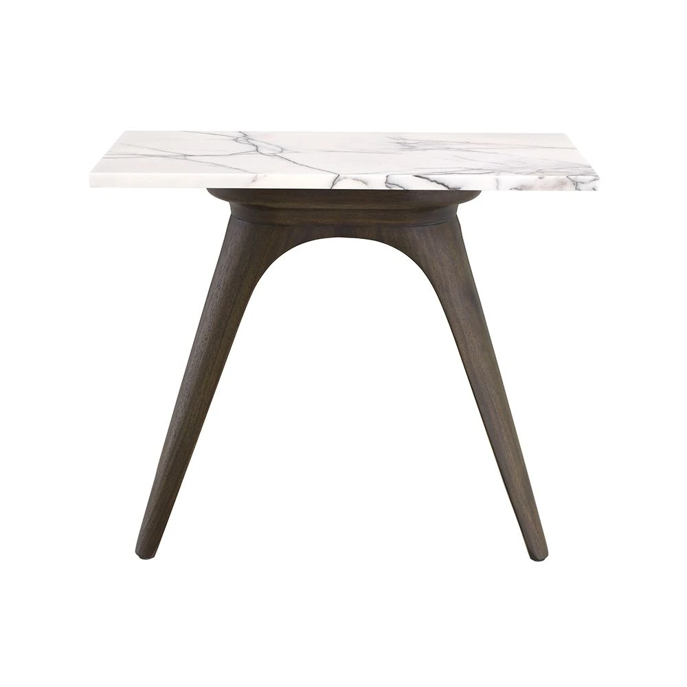 The beautiful, Borre Side Table is a one of a kind piece with a distinctive design and minimalist appeal. This sophisticated side table exudes style with it’s contrasting materials which will allow it to make a sublime statement in any interior. This contemporary accent table features a luxury, Italian bianco lilac marble table top and is elevated on a gorgeous mocha finish frame with tapered legs.