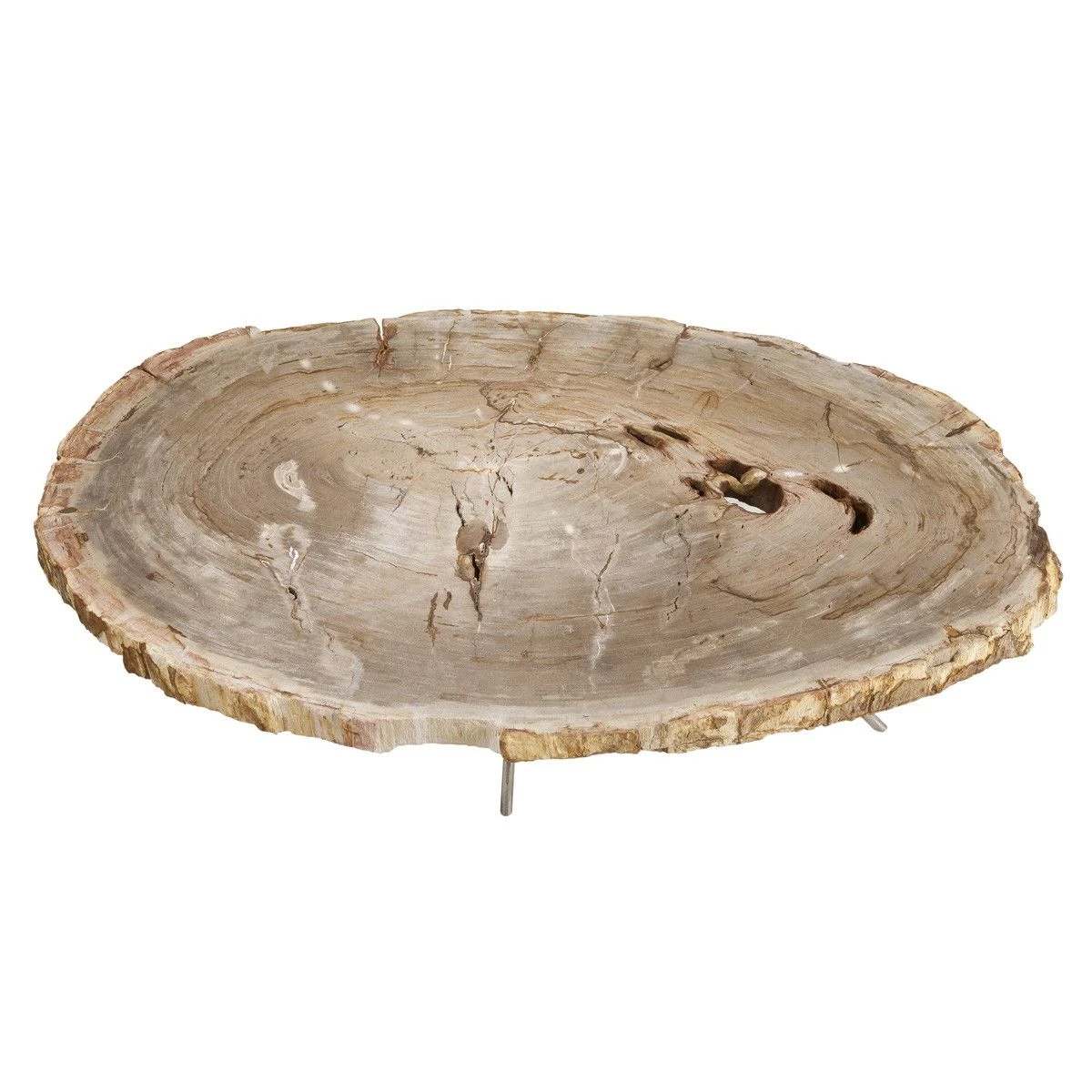 Bring the beauty of nature into your home with the Barrymore Coffee Table. A slim polished stainless steel structure holds up a thick slice of petrified wood that owes its unique character to its distinct grains, knots and holes.