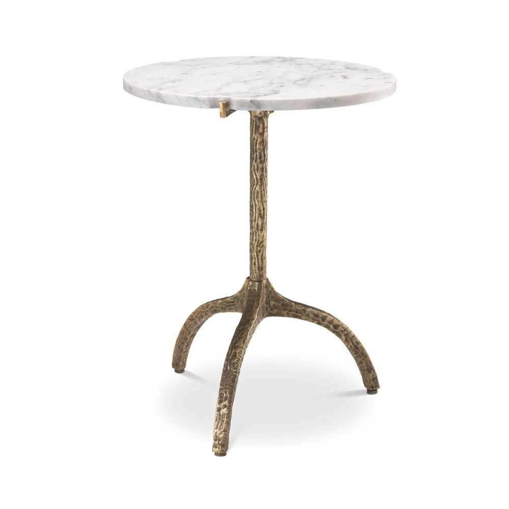 Introducing the elegant Cortina Side Table. This luxurious piece features a marble surface elevated by a hammered brass base in an antique brass finish for a vintage feel. It’s a charming piece for accentuating your living room.