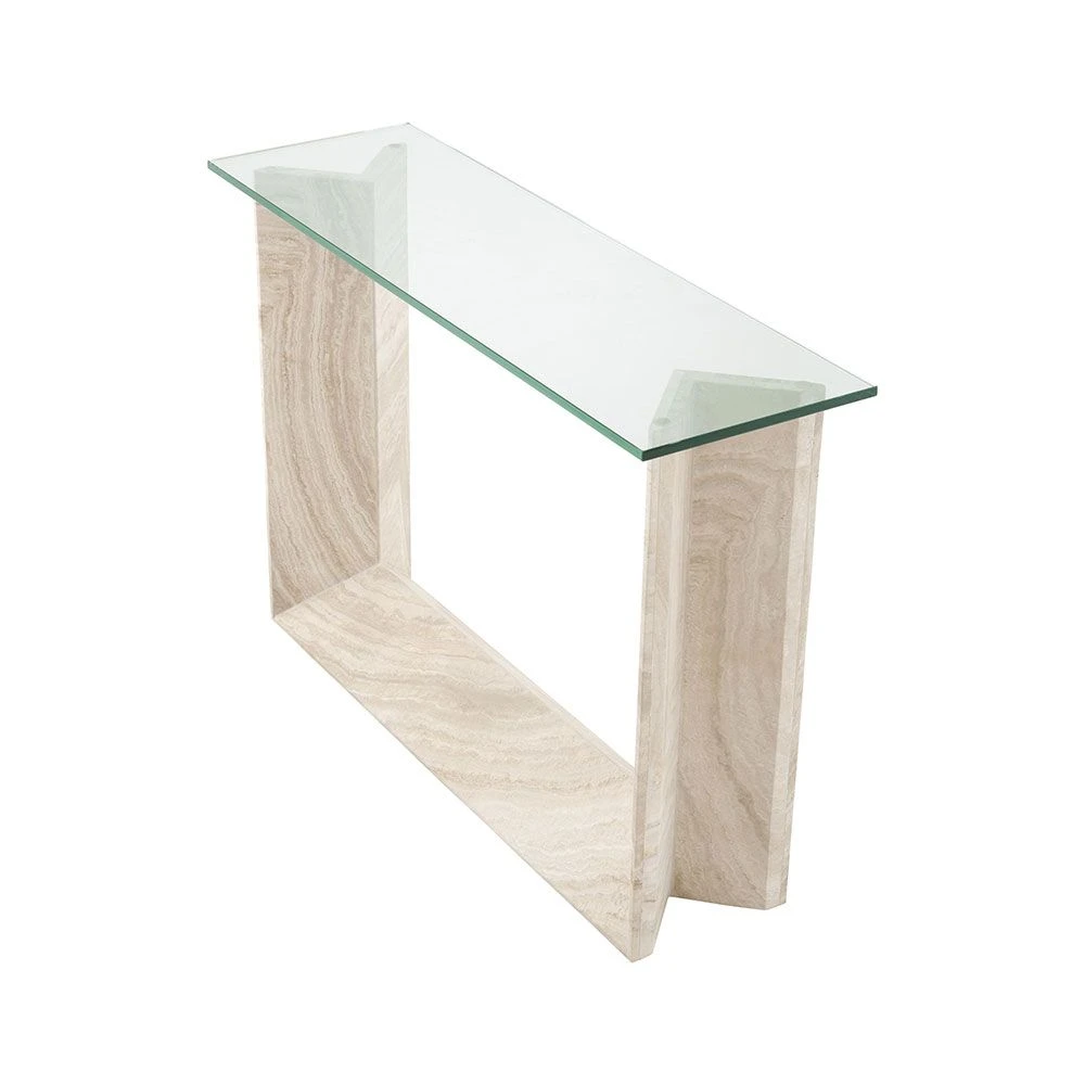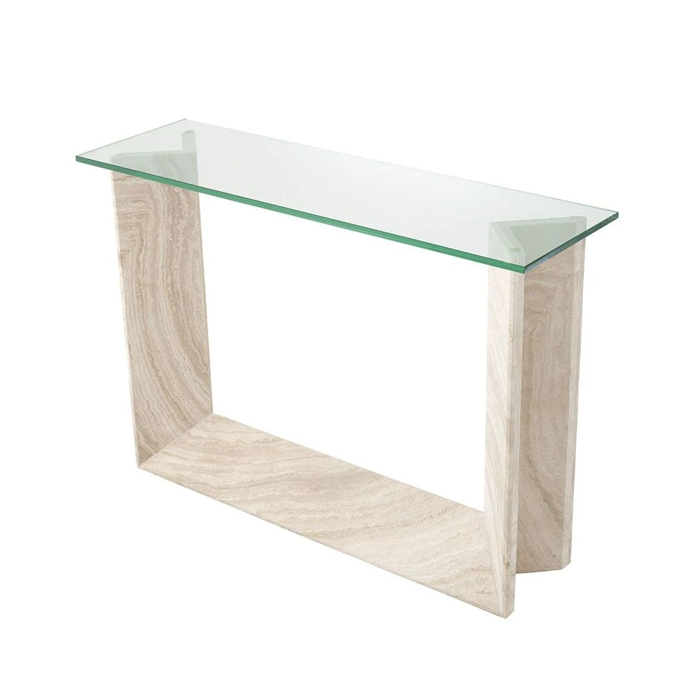 Indulge in some class and elegance with this striking console table from Eichholtz. With its refreshing and neutral travertine base, supporting a sleek glass surface, this piece exudes a contemporary appeal that will create a truly luxurious environment.