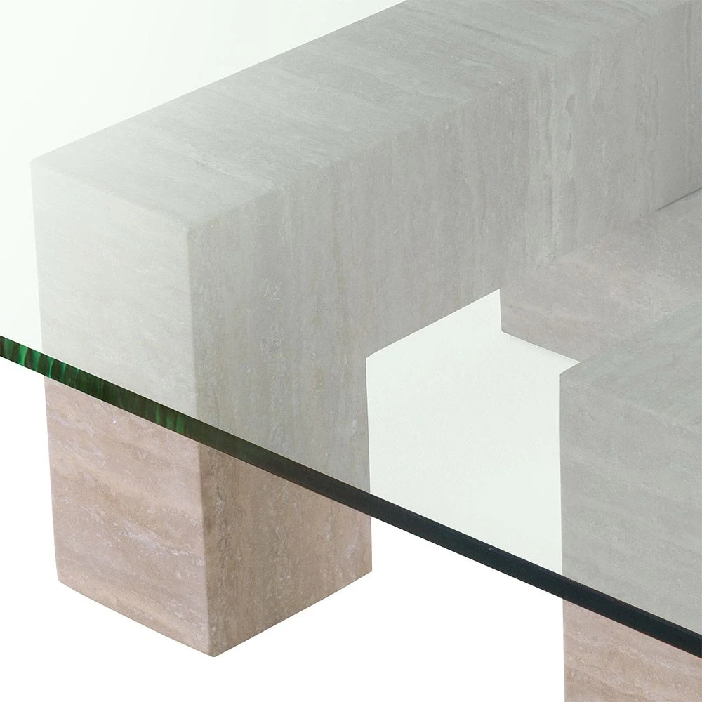 Adorn your lounge or living area with the undisputable elegance exuded by this Ikal Coffee Table. With its sleek glass surface and blocky, modern travertine base, this piece combines structured and bold design with delicate elegance, making it a sculptural marvel, perfect for a variety of interiors.