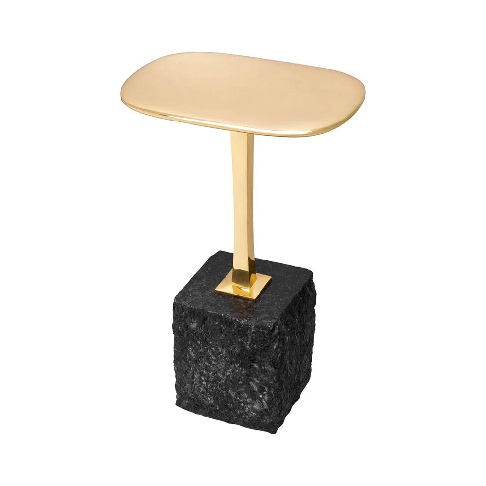 The Kayan Side Table S is a captivating fusion of textures and materials. The table showcases a rough black granite base, highlighting the natural beauty of hand-cut solid granite. Topping off the elegance, a polished brass surface adds a touch of sophistication, beautifully contrasting with the rugged allure of the granite base. The side table is a remarkable and eye-catching addition to any living space.