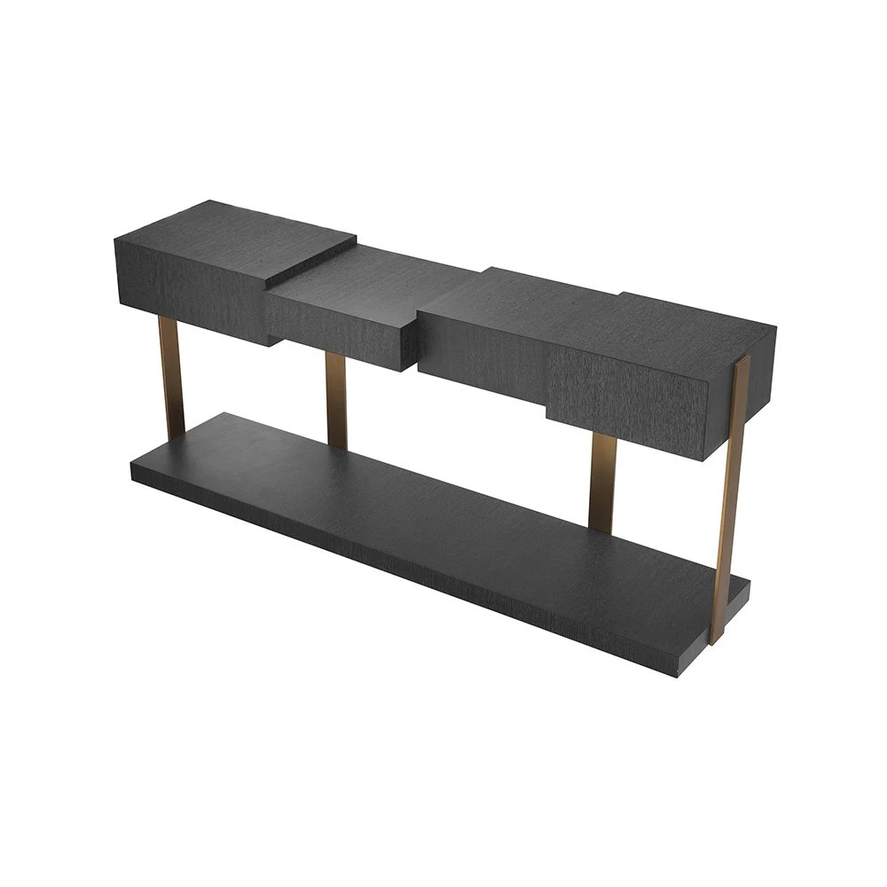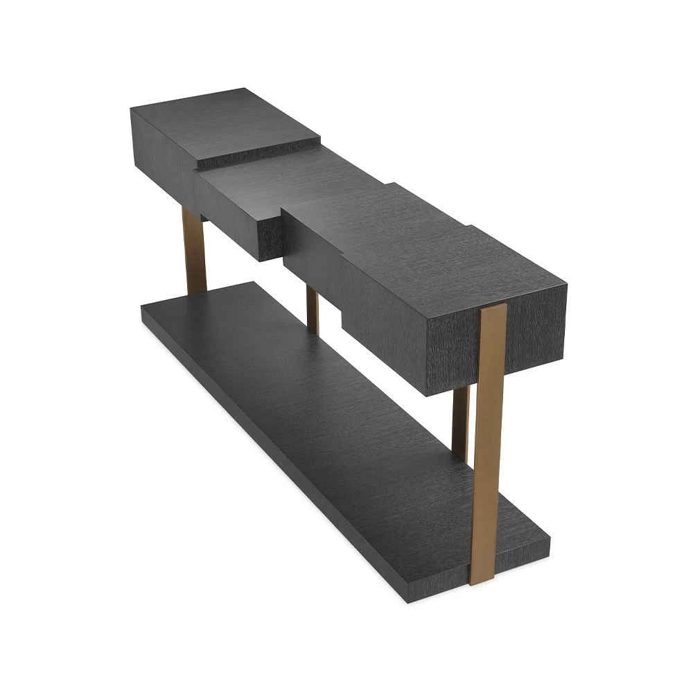 Enhance your living space and make a show-stopping statement in your home with the modern, Nerone Console Table. This chic console table boasts a distinctive and abstract design which features stylish, charcoal grey blocks crafted from oak veneer and beautiful, brushed brass details. It will make a sophisticated addition to any living room, hallway or dining room. It’s even complete with two surfaces for displaying all of your lovely decorative pieces.
