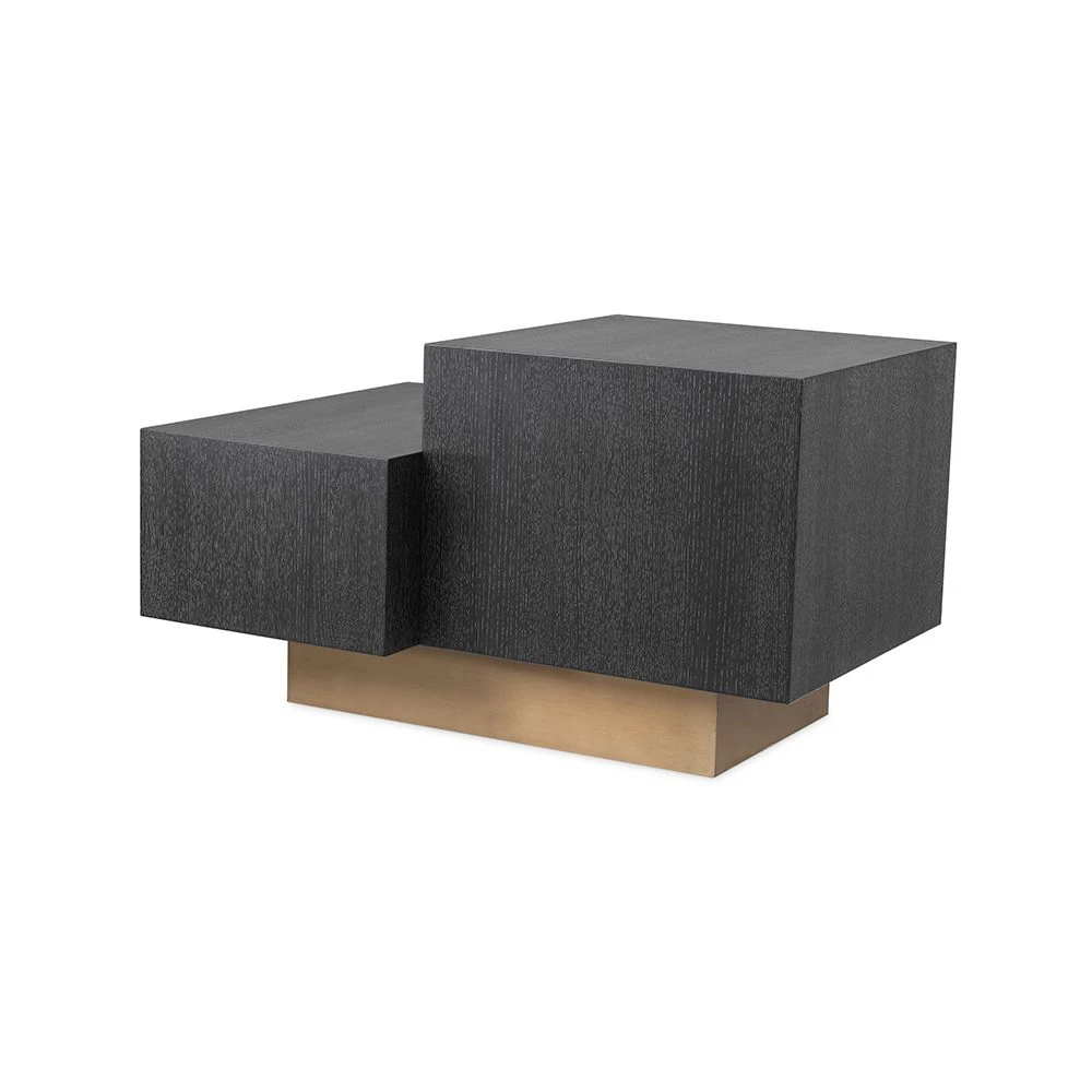 Incorporate this statement side table into your living area to bring a sense of luxury and everlasting style to your home. This sophisticated side table features a modern and unique design consisting of two large, beautiful blocks crafted from charcoal grey oak veneer and elevated on a glamorous brushed brass base. Its colour contrast and abstract design makes this charming side table the perfect statement piece.