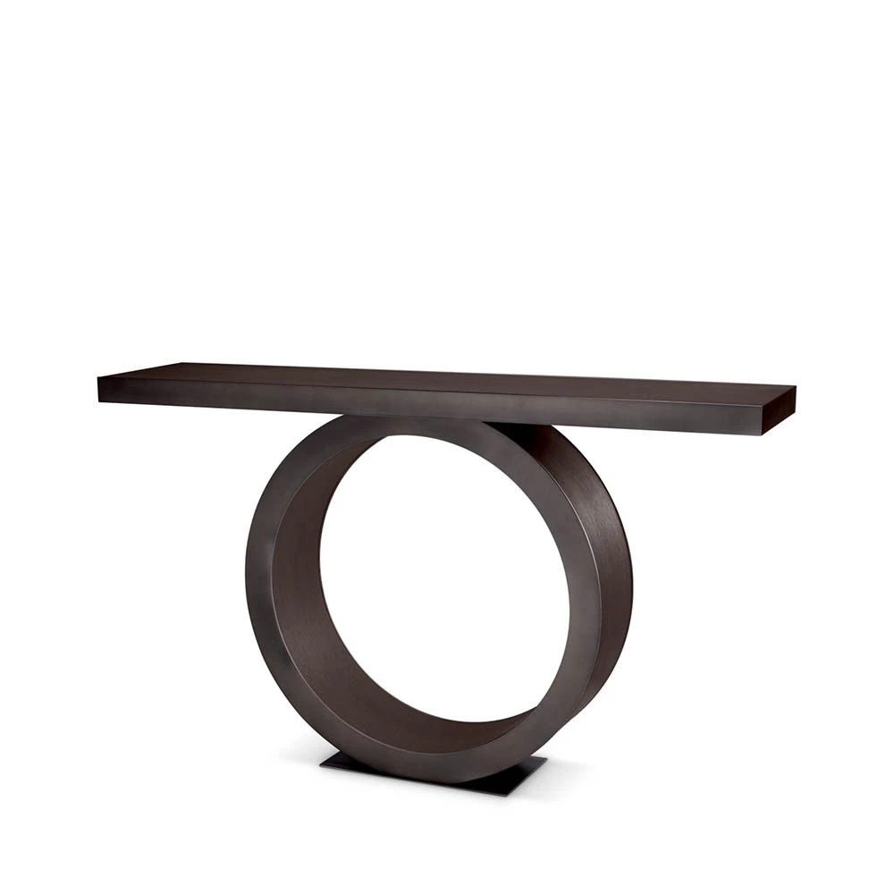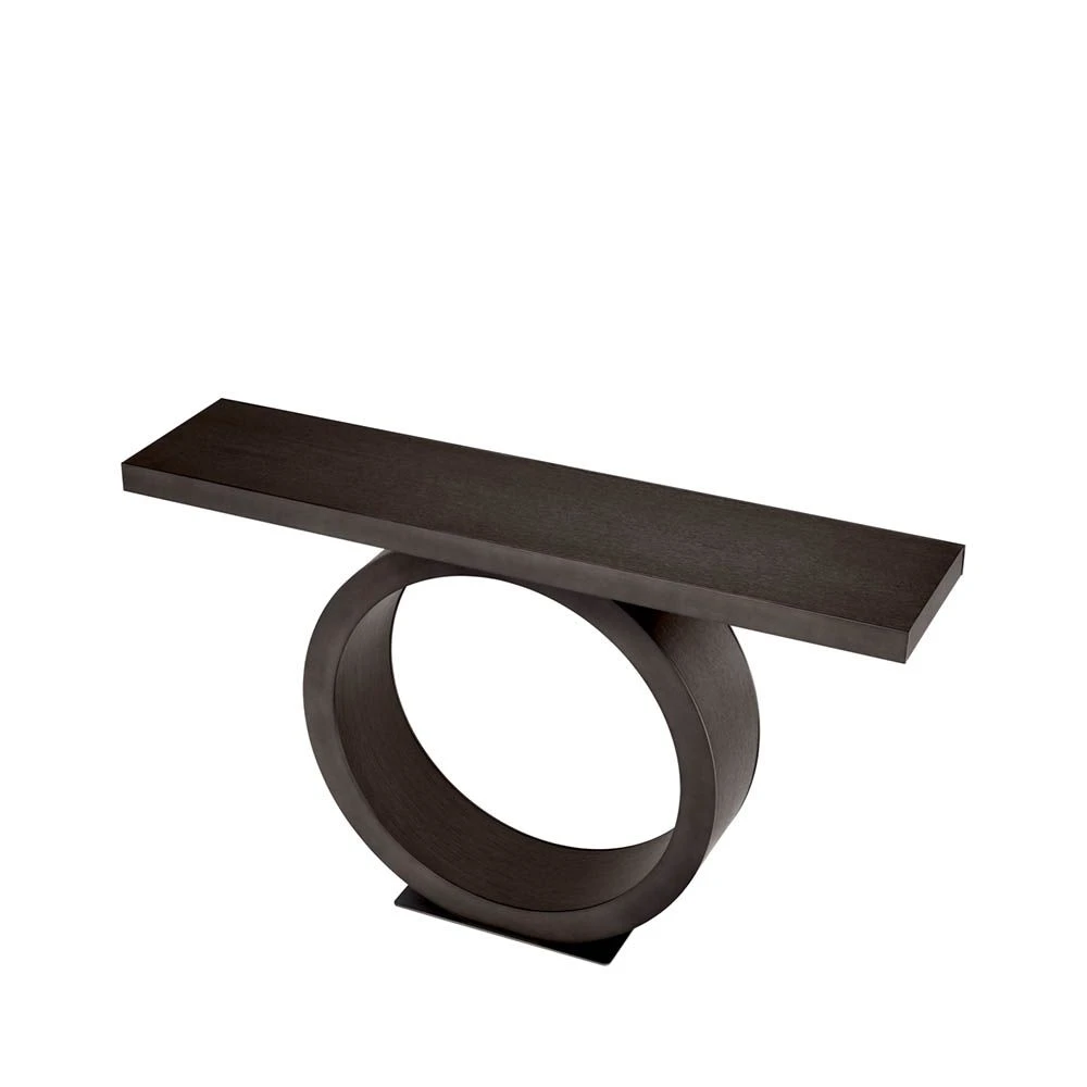 This Eichholtz Odis Console Table contributes a stunning balance to any space, with a strong table top supported by a rounded base. Dressed in Mocha Oak Veneer and stunningly sophisticated, this piece can be dressed up with sophisticated statues, candles, and books to create a wholistic visual appeal to your home.