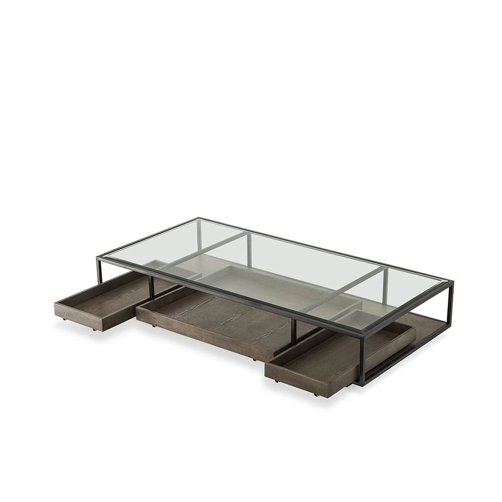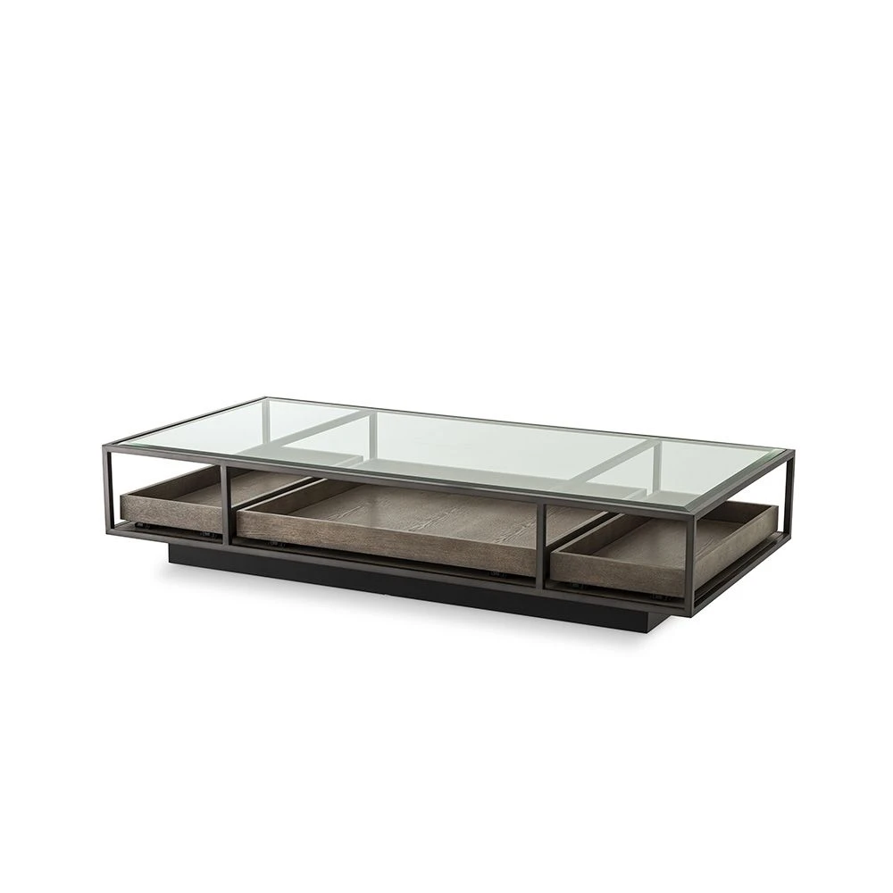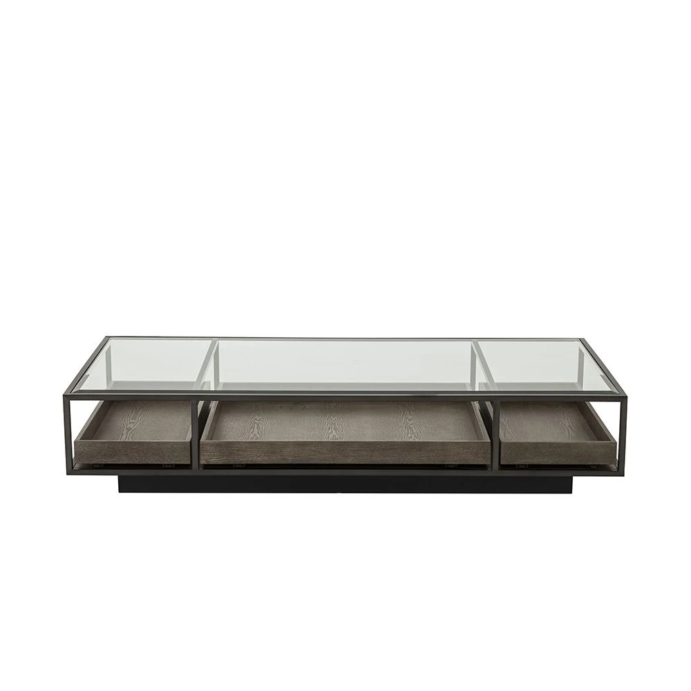 Incorporate some industrial enchantment into your decor with this striking Roxton Coffee Table. The three pull-out drawers, in a grey veneer finish, are visible under the glass top, allowing you to display and access your books and magazines while also storing them out of the way of the table’s surface.