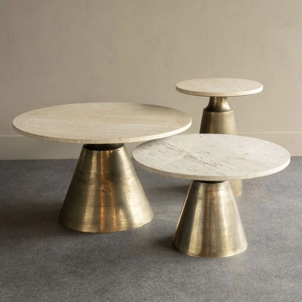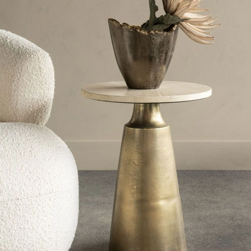 Accentuate your home decor with this stylish Filomena Side Table. This statement designer piece will bring sublime glamour to your space with its exquisite travertine top and glimmering gold base. Pair with the matching coffee table and side table for an added sense of irresistible dimension to your space.