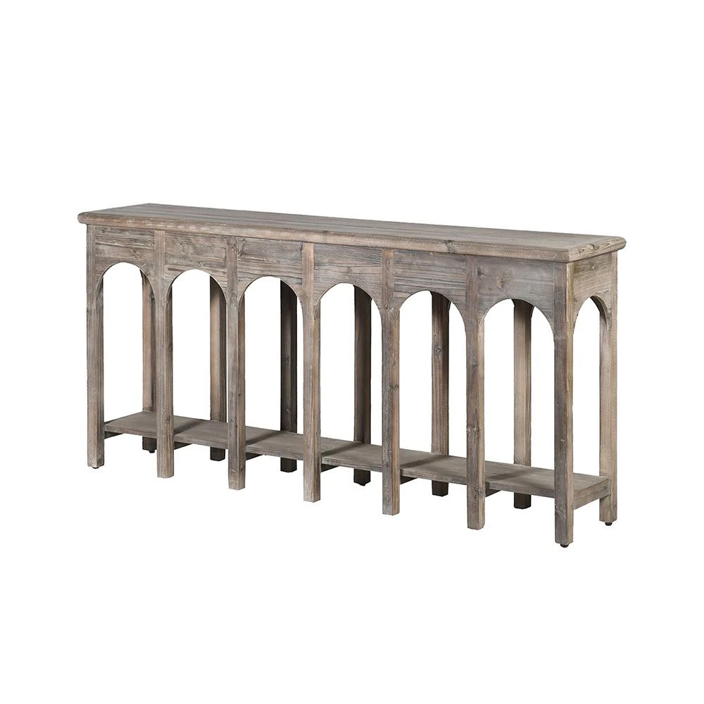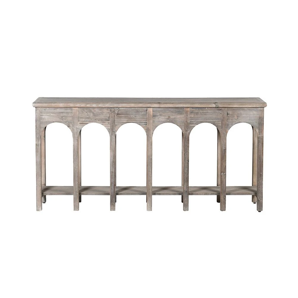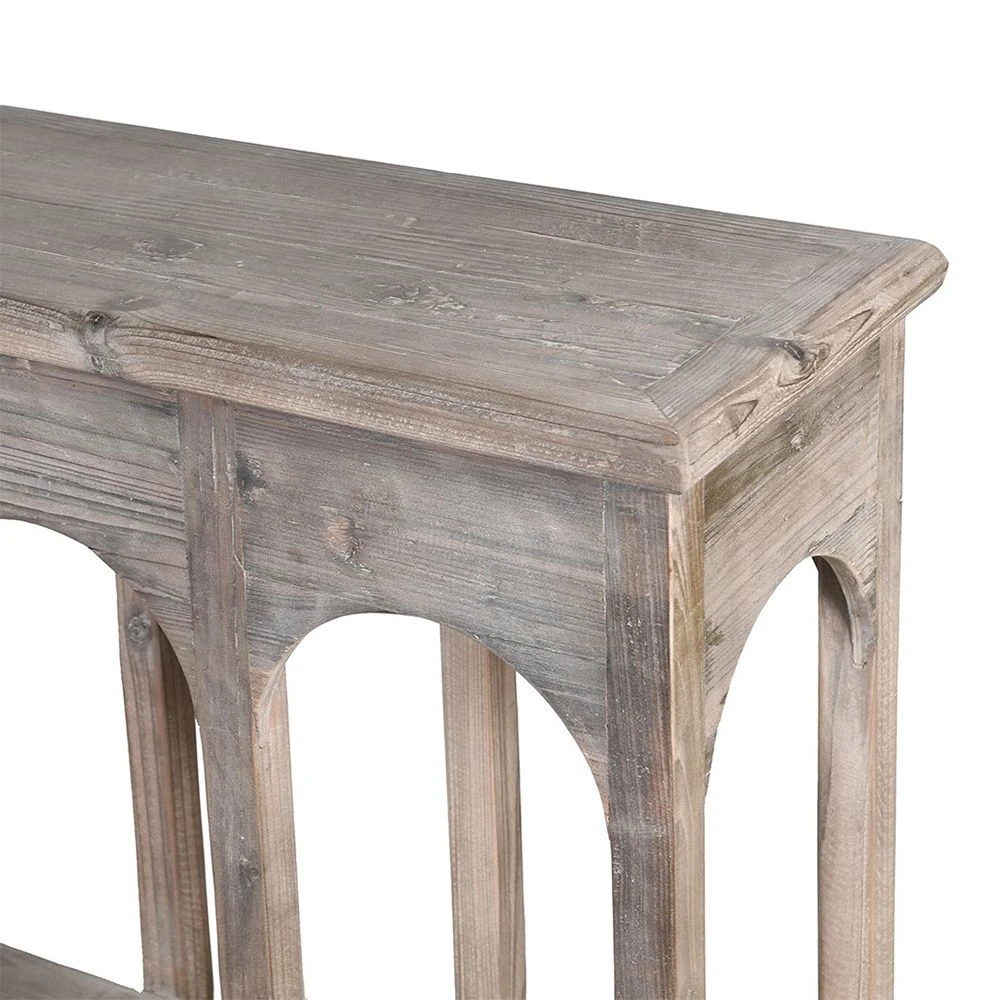 Accentuate your space with this striking Godric Grey console table. This console table features mesmerising arches and a suspended lower shelf that is perfect for decorative accessories. The gorgeous natural finish of this console gives it a captivating rustic appeal, perfect for french, country-style spaces.