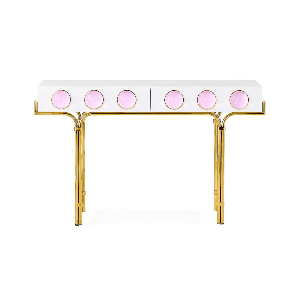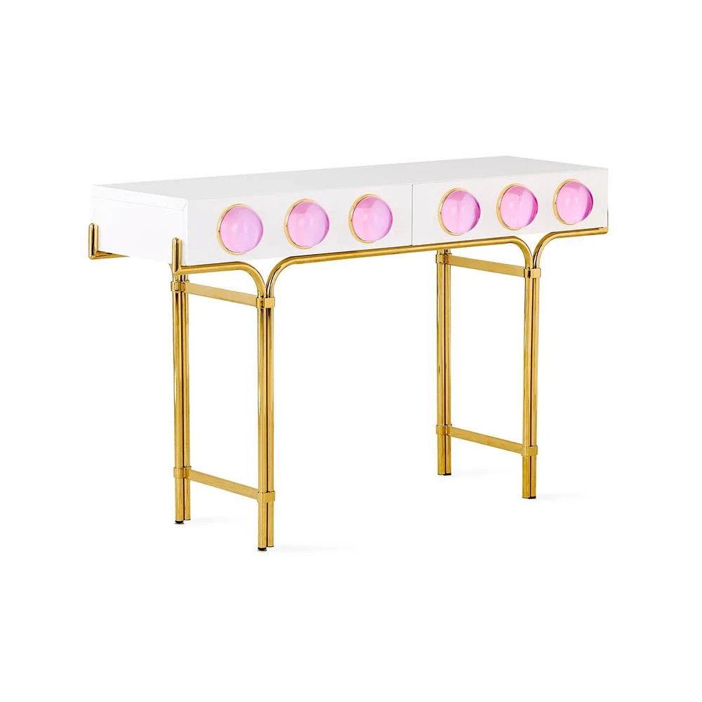 Embellish your home with the dreamy and stylish Globo Console. Featuring an acrylic orb design in a limited edition pink finish, this piece will exude a playful pop of radiance in your decor, proving to be the perfect statement piece for glamorous and chic home decor. With two drawers for storage, this piece is the perfect disguise for unsightly clutter. See also this piece in a finish.