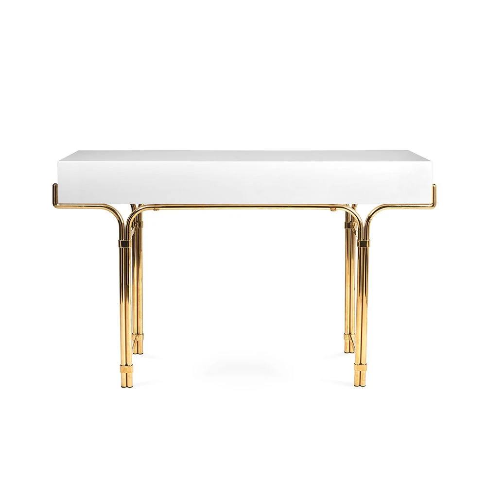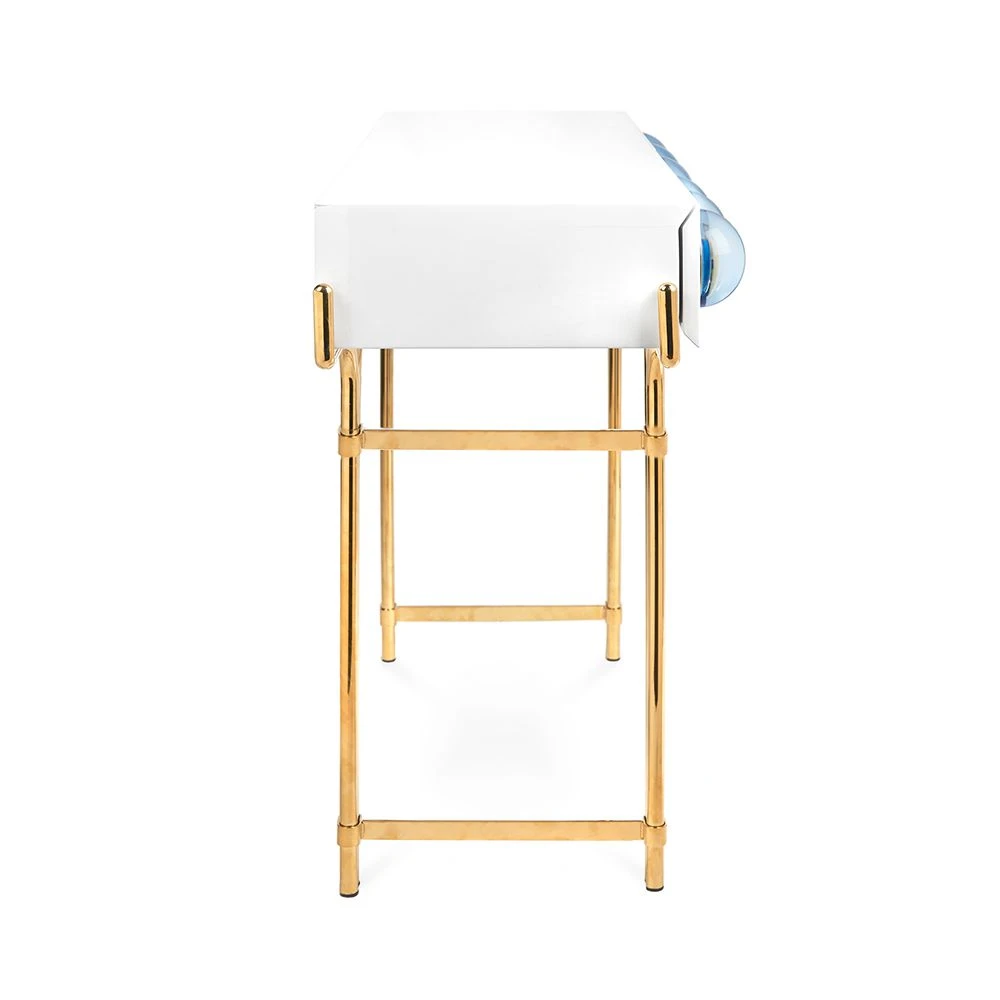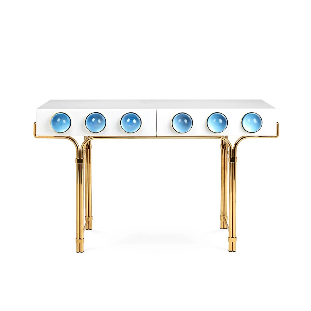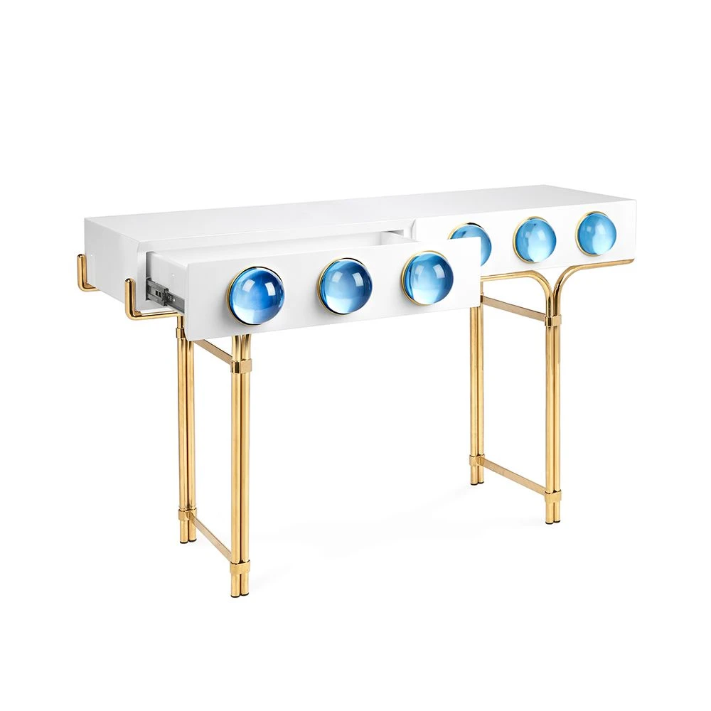 Welcome a sense of futuristic glamour to your hallway or living room with the Globo Console by Jonathan Adler. The white, high-gloss lacquer piece is brought to life by the polished brass base and large, blue acrylic cabochons.