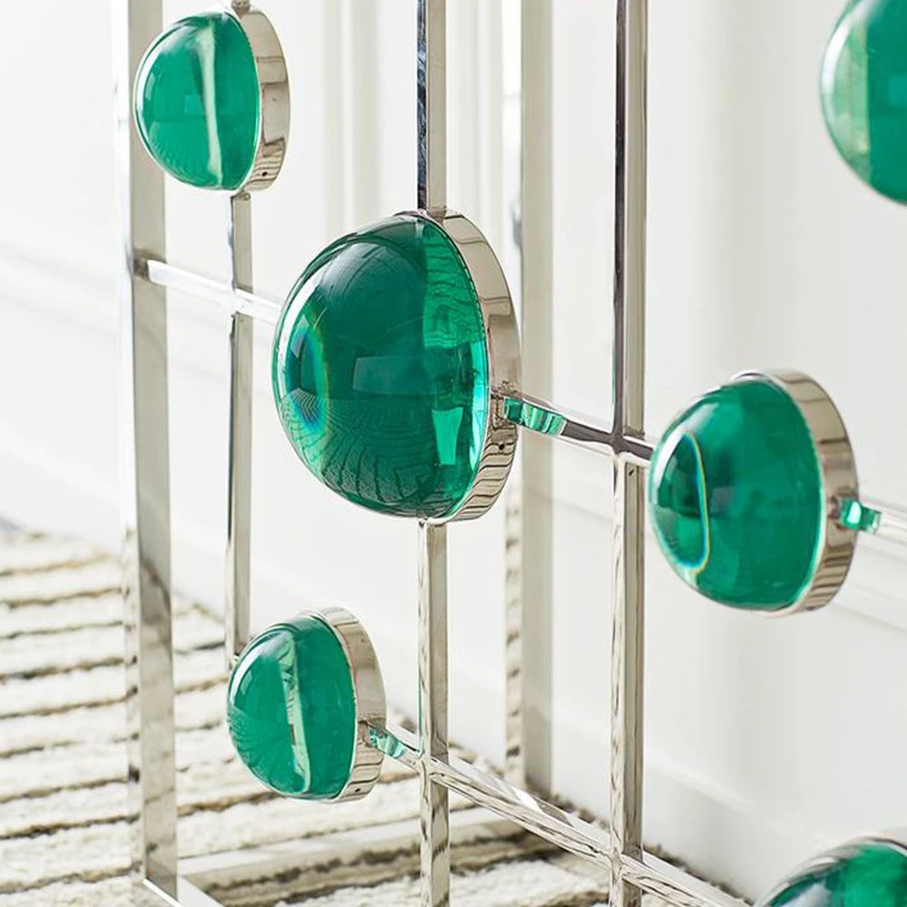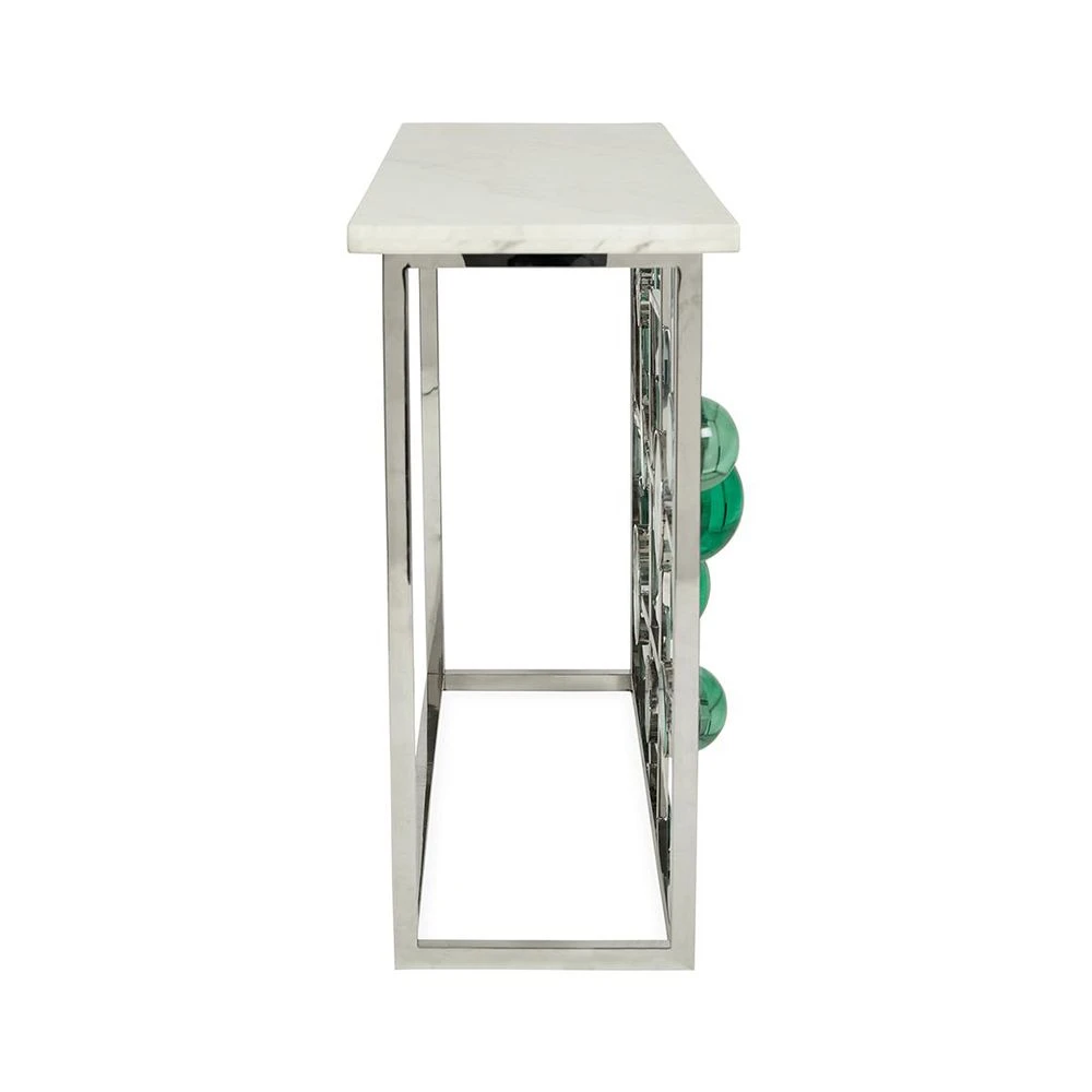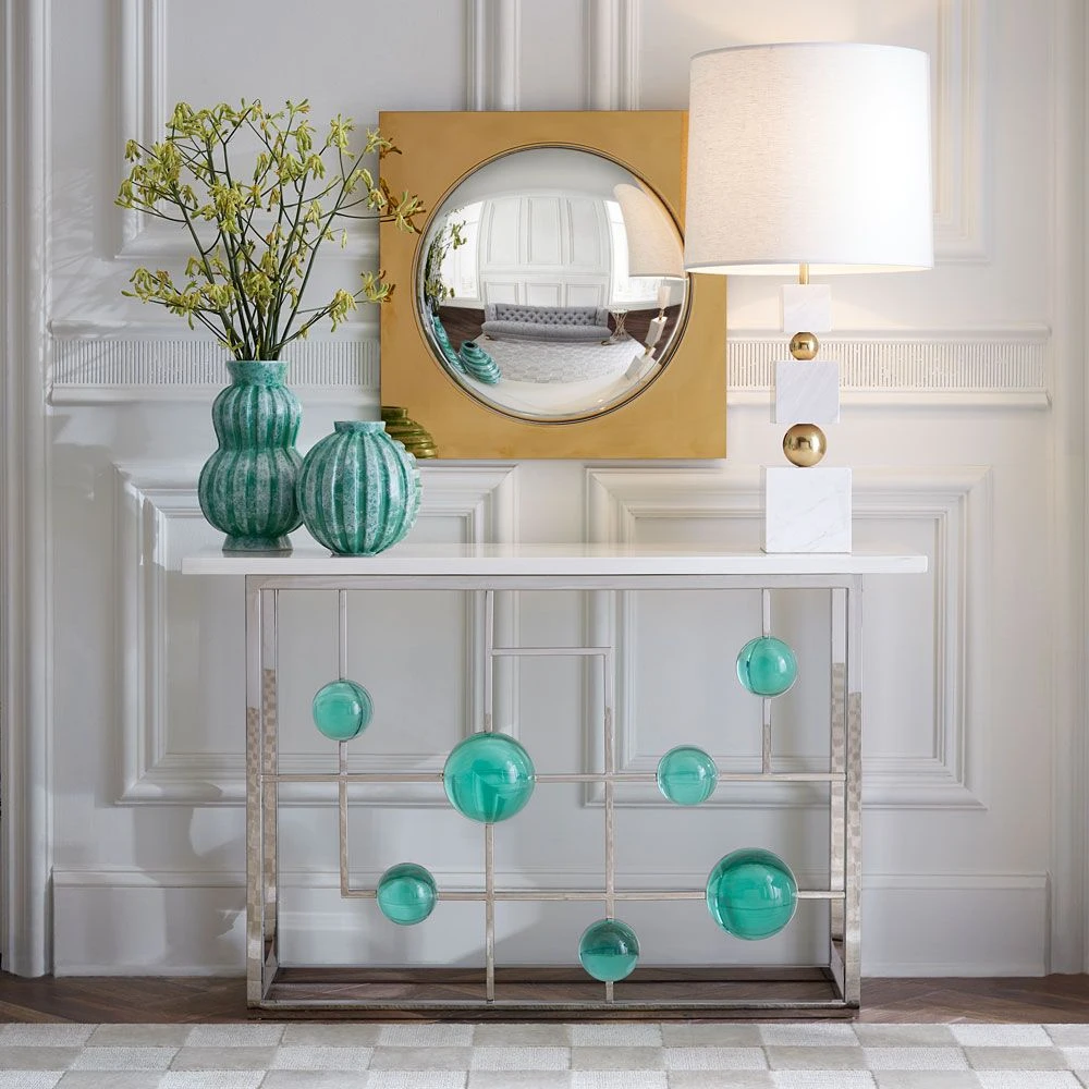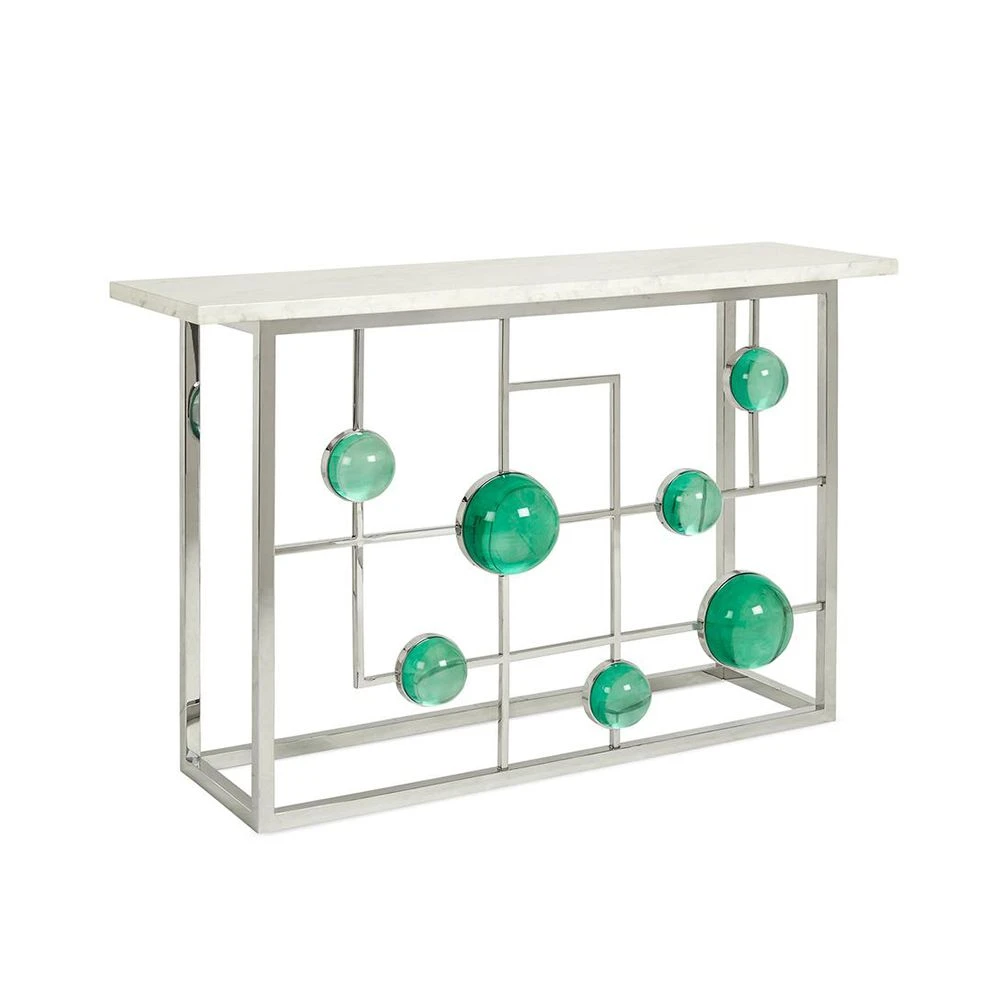 Transform your entryway or hallway with this fabulous piece! Complete with a chic marble top, the Globo Fretwork Console by Jonathan Adler is also adorned with mesmerising emerald acrylic cabochons.