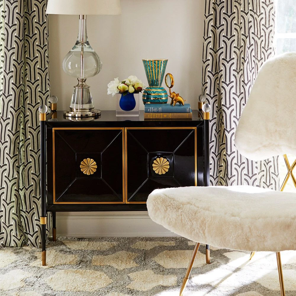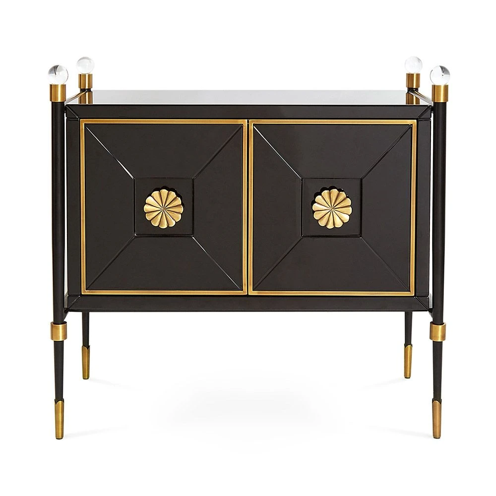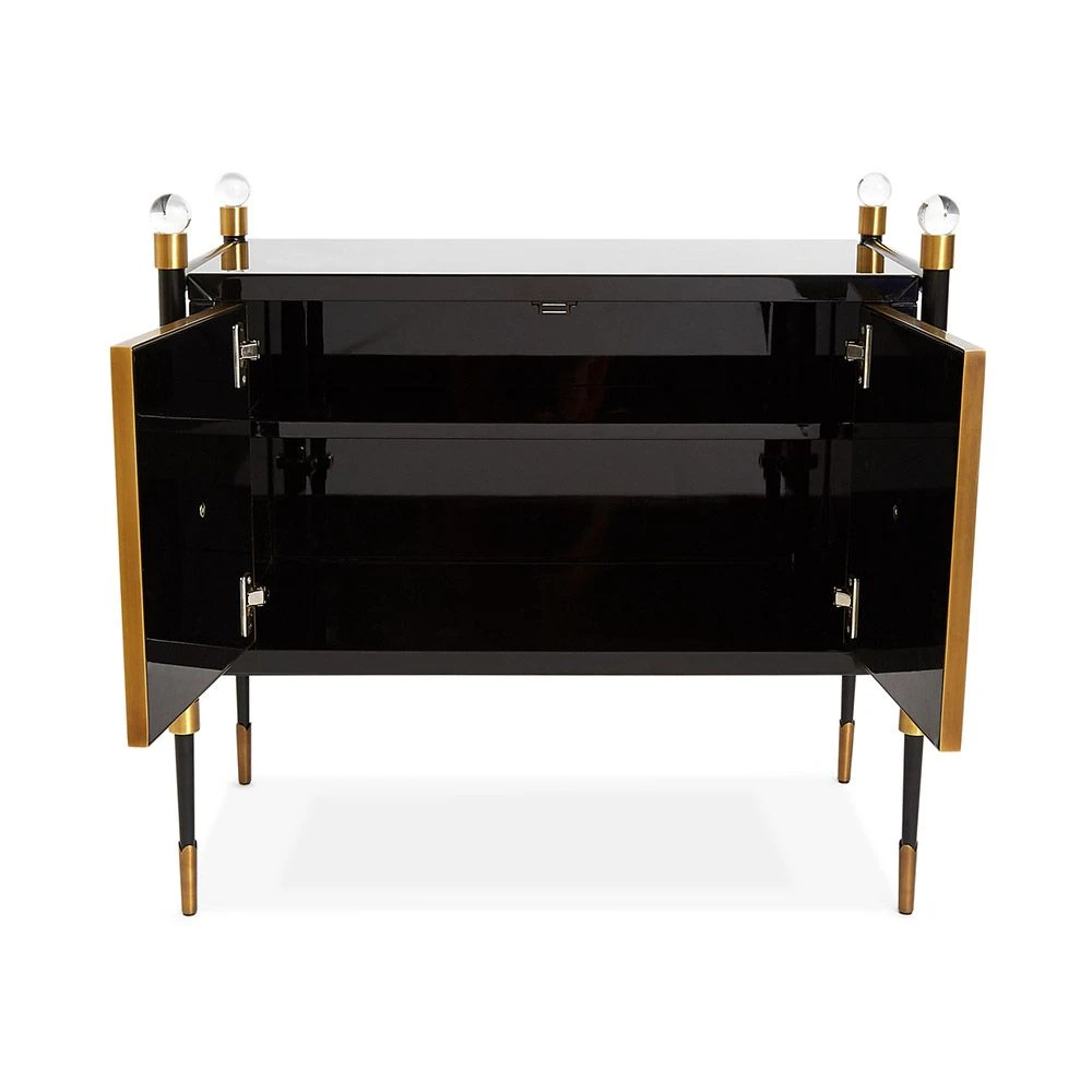 Add a vintage Parisian flair to your home with the exquisite Rider Cabinet. The glossy black lacquer and antiqued brass accents will infuse a sense of timeless elegance into your interior space. Complete with adjustable interior shelving, it is a stylish storage solution for any part of your home.