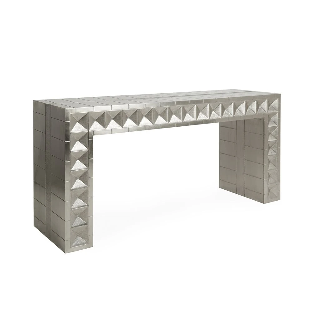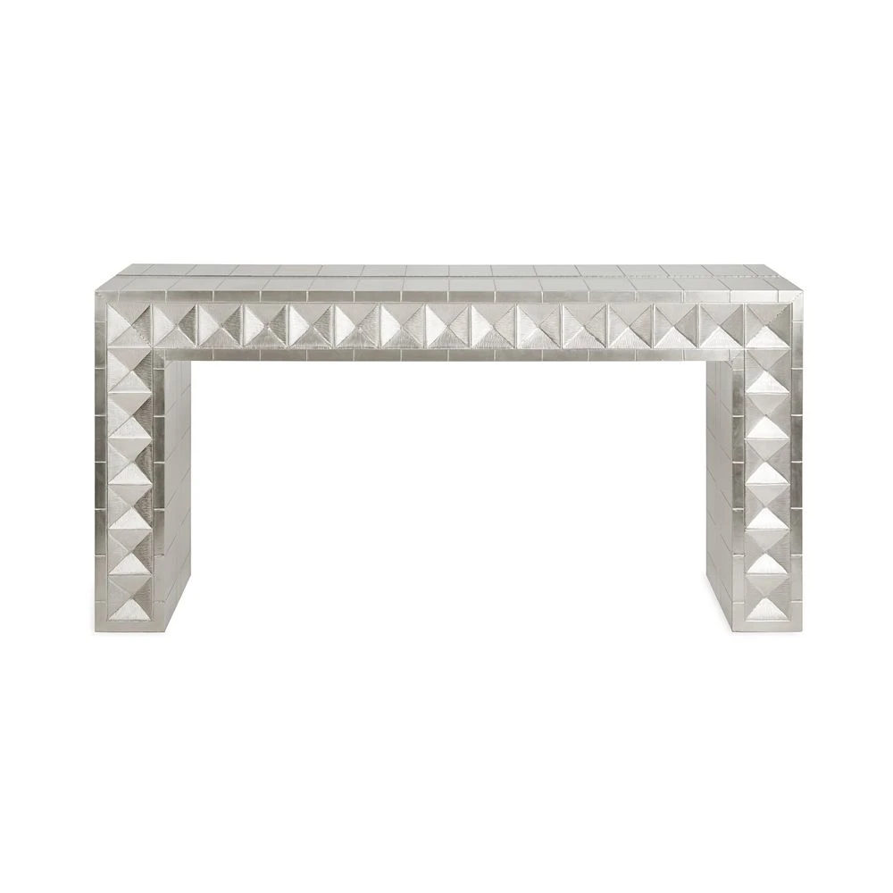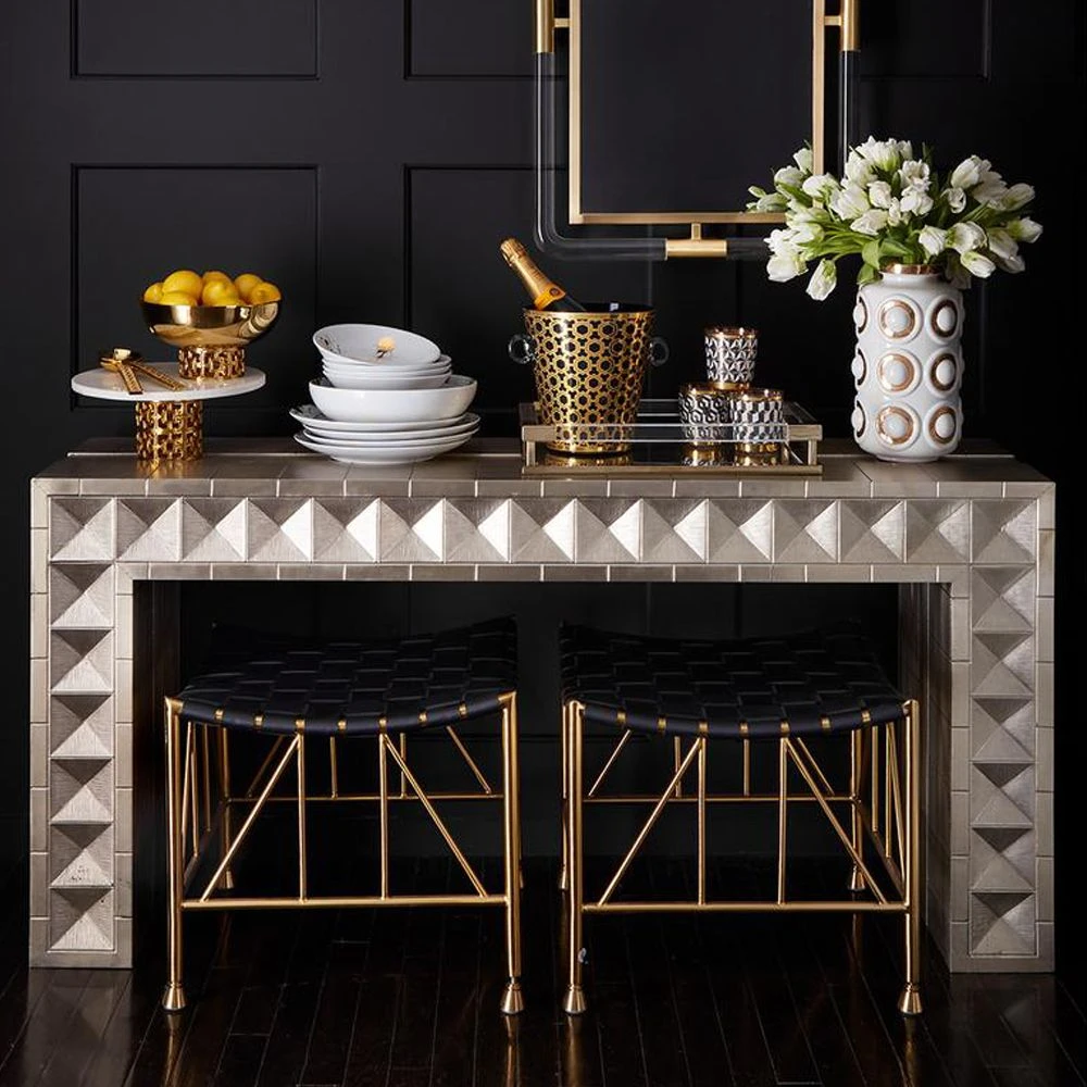 Revive your hallway or living room with the luxurious Talitha Waterfall Console by Jonathan Adler. Hand-stamped and crafted by artisans, this marvel of a console is perfect for adding a captivating touch of modern glam to any setting.