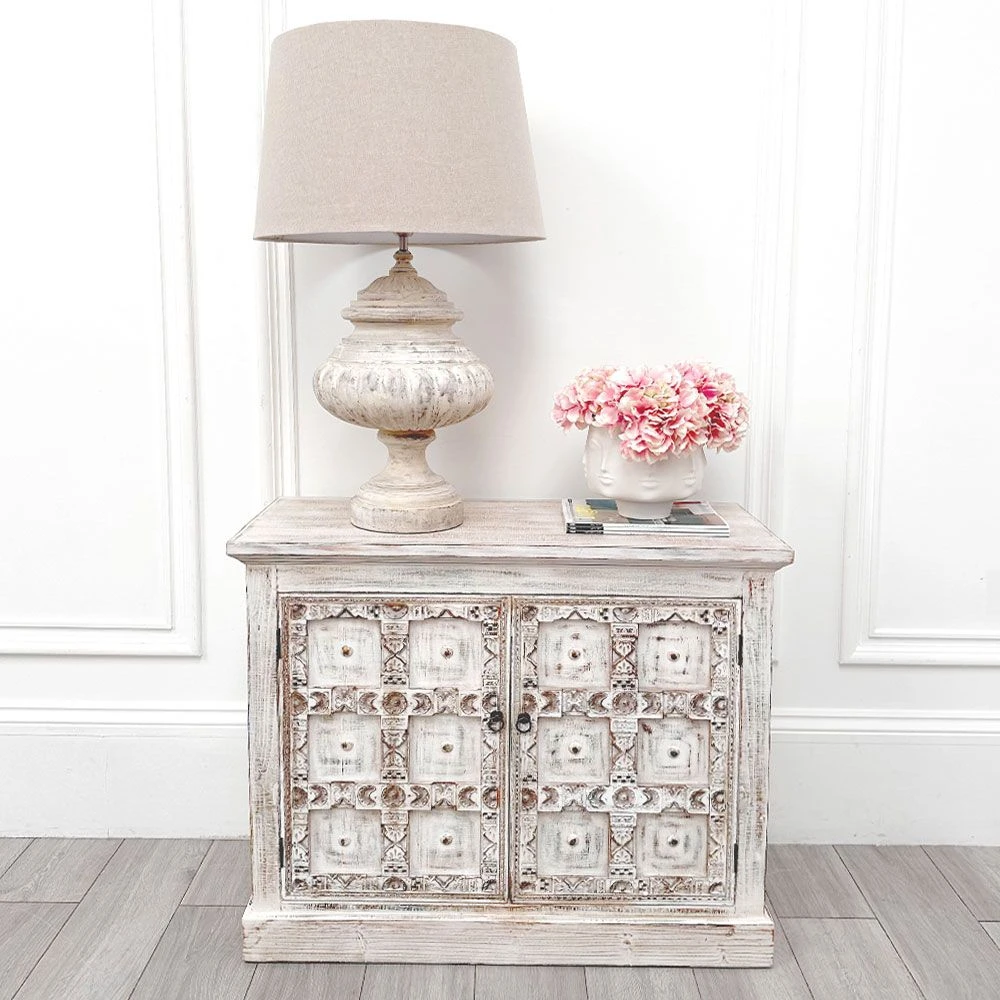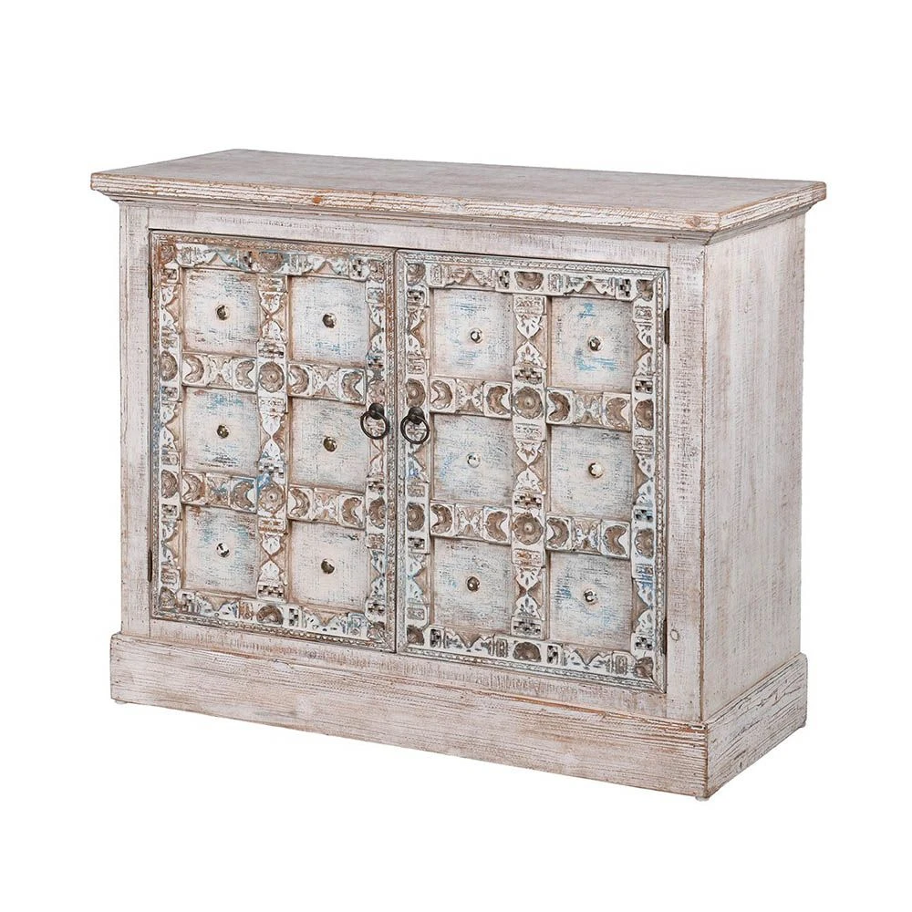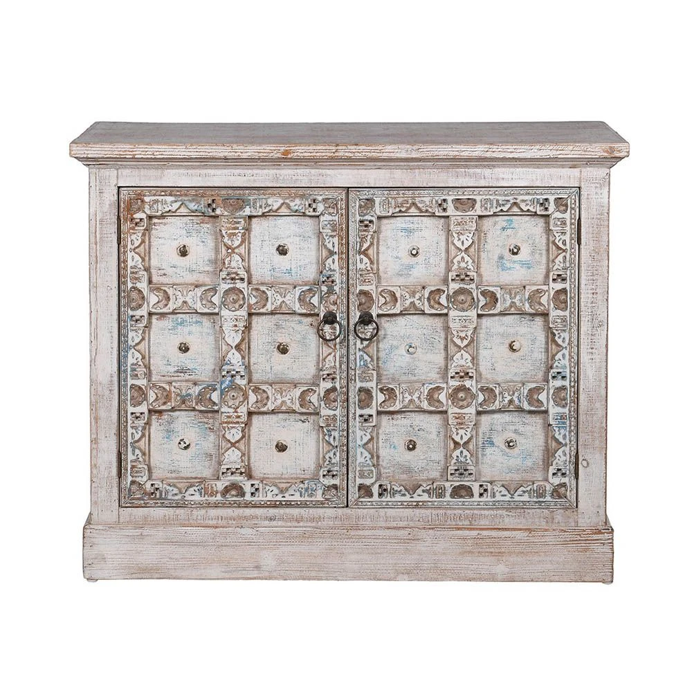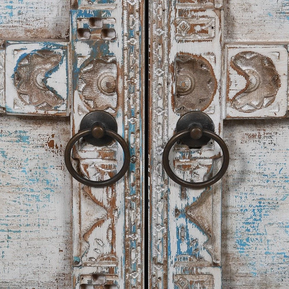 Accentuate your space with this ornate Lazuli Cabinet. The elegant carved details of this piece give it a truly magnificent allure that will enhance any space with distressed chic while offering ample storage for any household clutter.