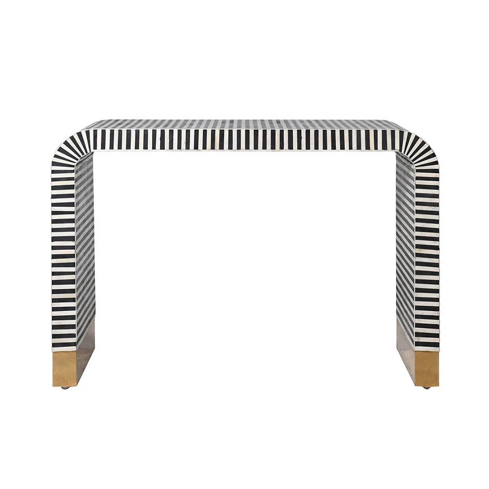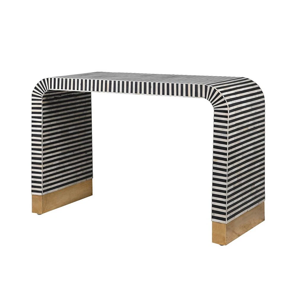 Embellish your space with the monochromatic glamour of the Mauritz Console Table. With bone inlay detailing and complementary gold feet, this curvaceous waterfall console is the perfect touch of opulence for any contemporary space. Dress with some elegant alabaster lamps for an enchanting and statement appeal, and see its sister piece the