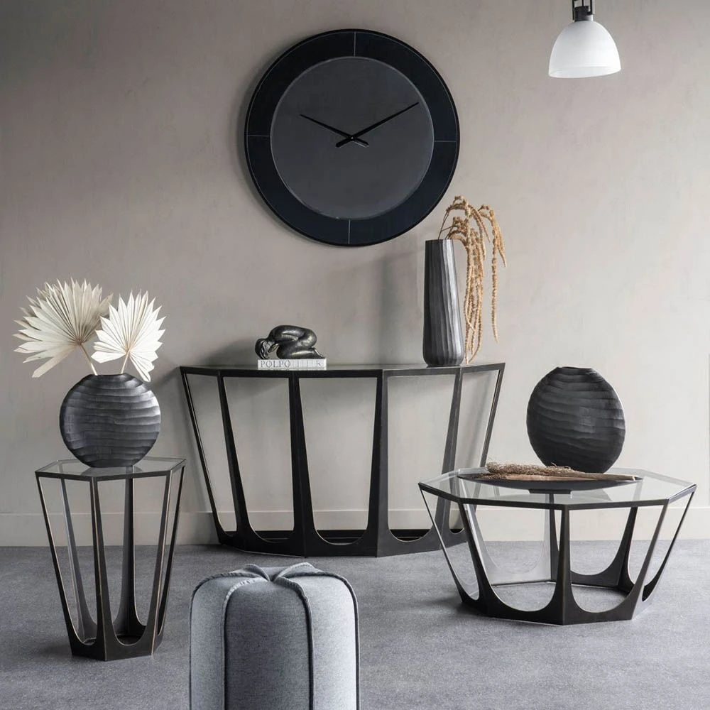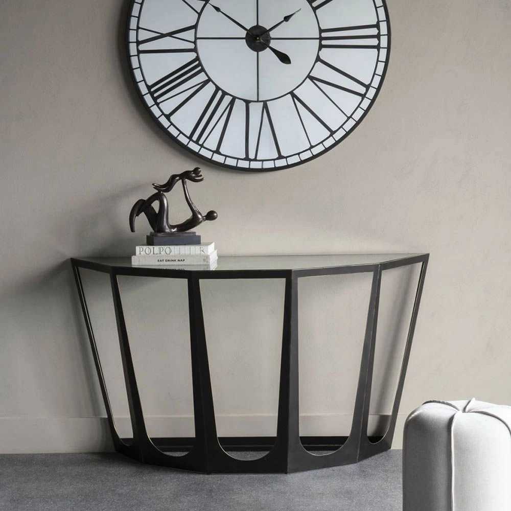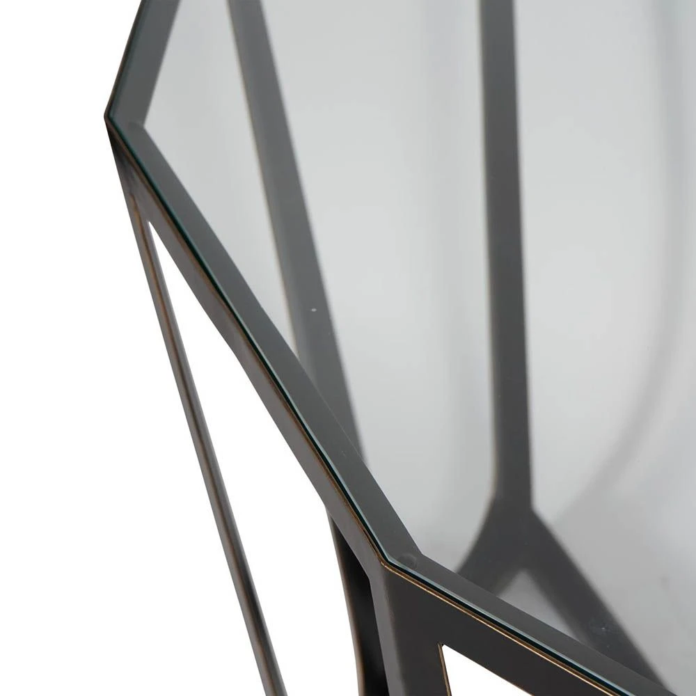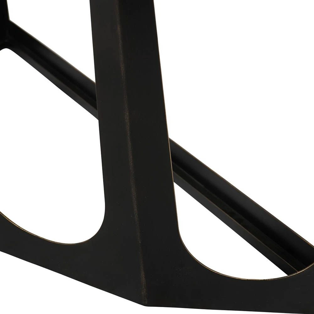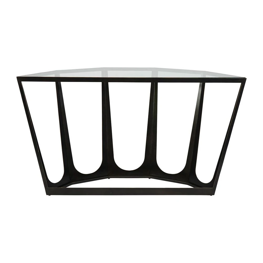 There is a certain architectural glamour to this piece that makes it a visually intriguing addition to a modern space. The glass surface elevates the sleek appeal of this console, while the durable iron base is finished in a gorgeously rich bronze for a dash of industrial drama.