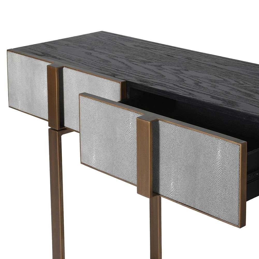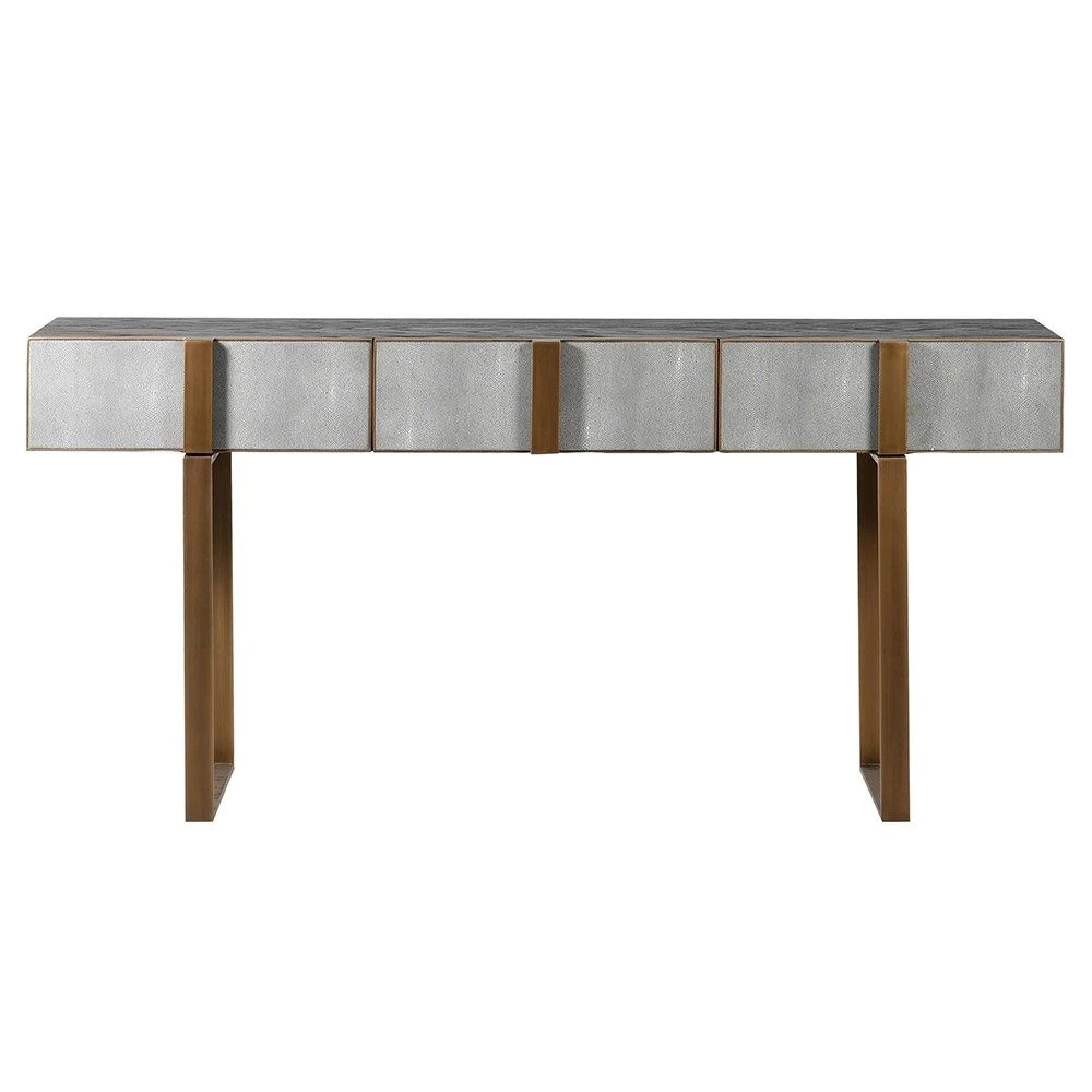 Enhance your living space with the sophisticated and stylish, Osaka Console Table. This contemporary console table is crafted from oak and features three stunning shagreen drawers which are accentuated beautifully by its bold brass details. It will make a statement in any room you decide to place it in and is complete with a large top surface that’s perfect for displaying decorative pieces and fabulous florals.