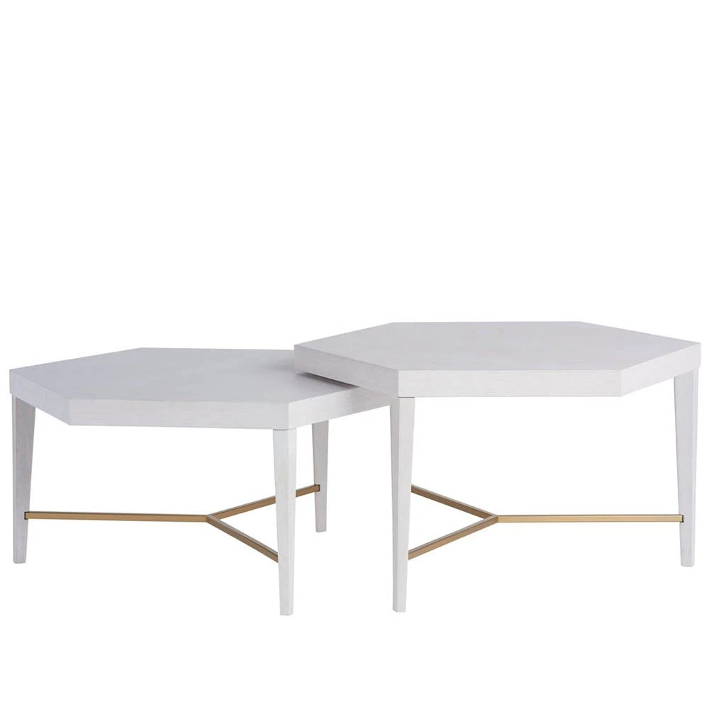 A fresh and glamorous take on the bunching table trend, the Sydney Nesting Coffee Tables find perfect harmony with two striking hexagonal tabletops highlighted by a clean Alabaster finish. A unique x-shaped stretcher baseina soft gold metal accent completes this versatile piece.