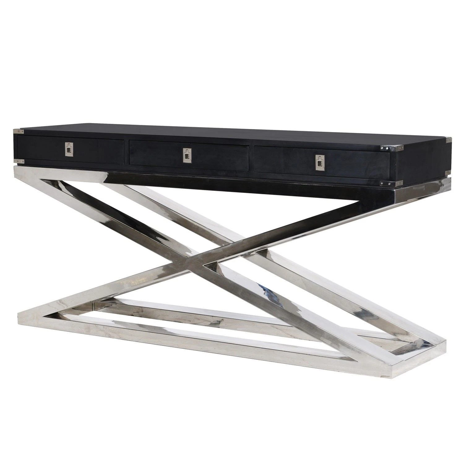 Our Draper Console X Frame table is stylish and contemporary, which would not only add a sophisticated touch of modern chic to your home, but its sleek black finish and intricate nickel finishings will allow this piece to look fantastic among a wide range of different furniture styles and colours. Not just a gorgeous piece, this table has three handy drawers for storing store away stationary, letters, keys or those important bits and bobs you simply canβt throw away. A must have for any…