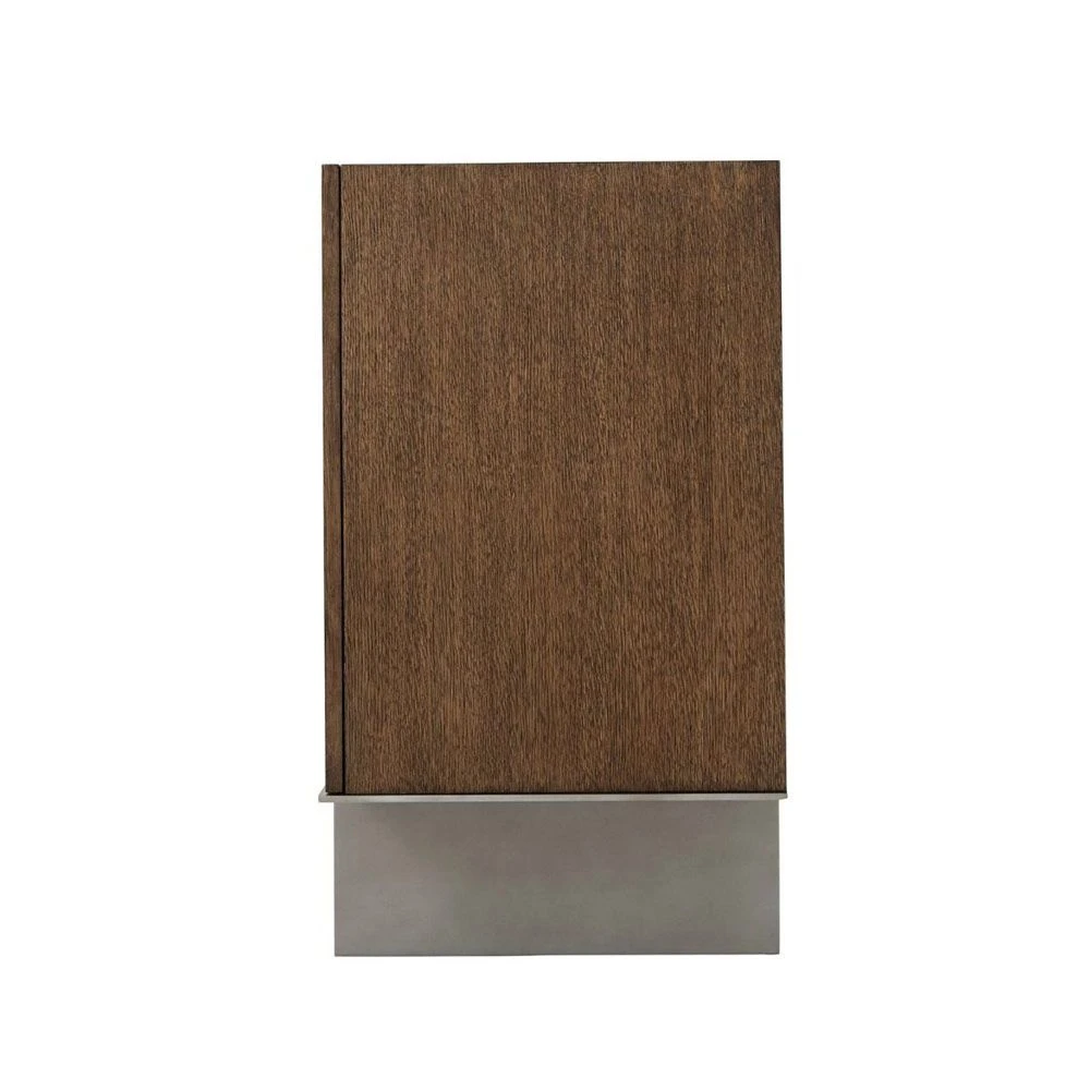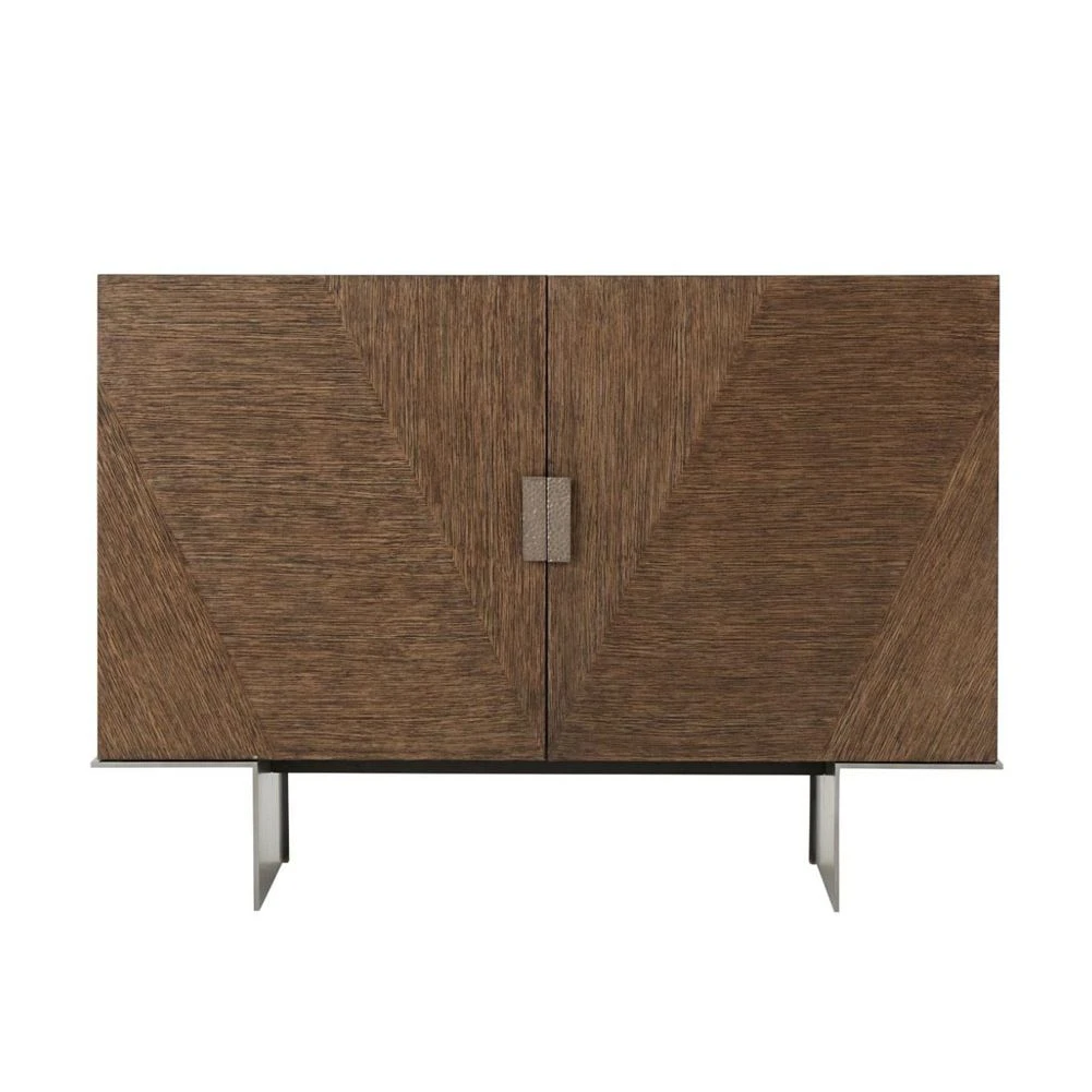 This beautiful, boxy cabinet exudes Mid-Century Modern elegance with its subtle parquetry on the doors and chic, bronze base. It features hammered bronze handles and an interior that contains a shelf and a drawer for maximum organised storage potential. This side cabinet is guaranteed to introduce an exquisite sense of sophistication to the space it adorns.