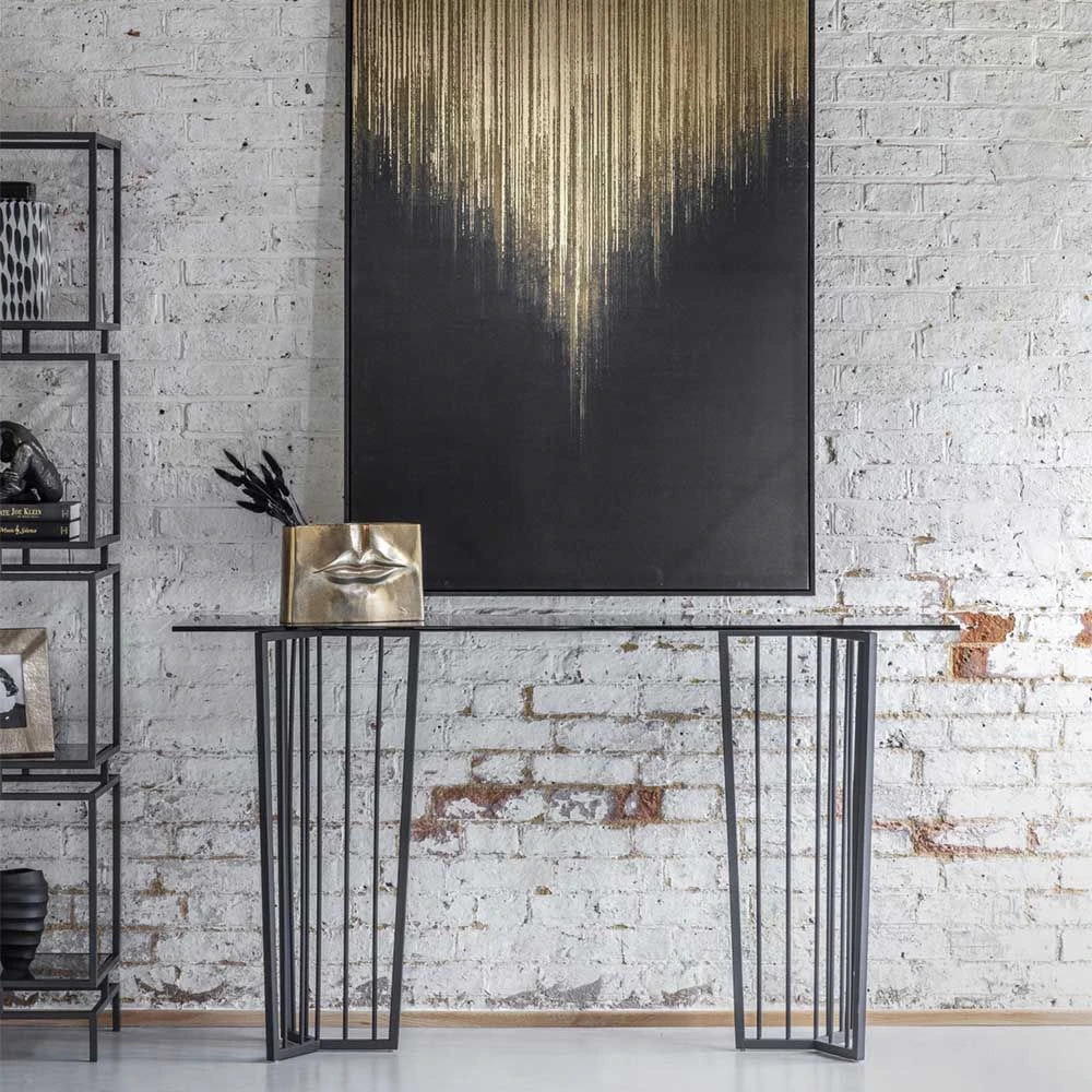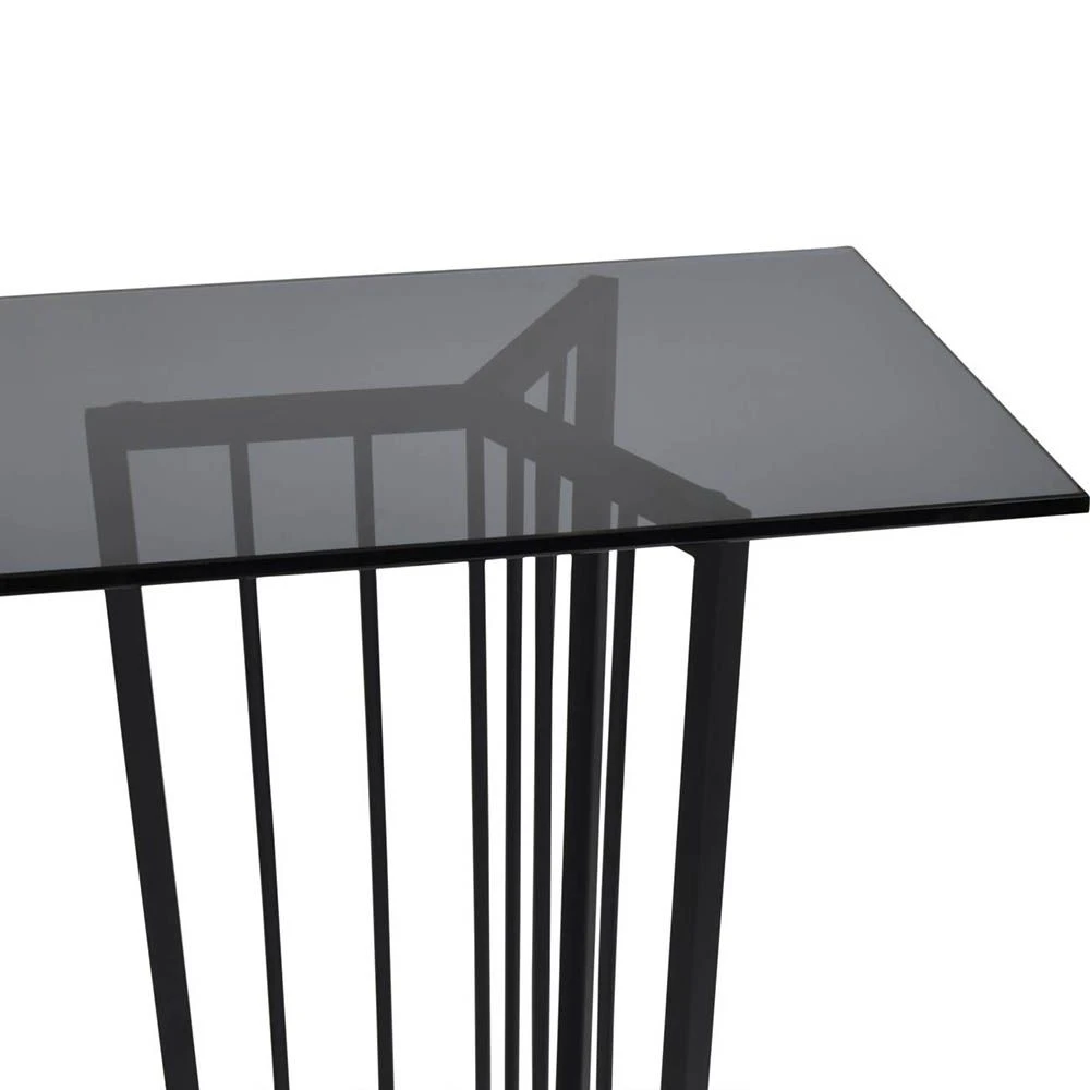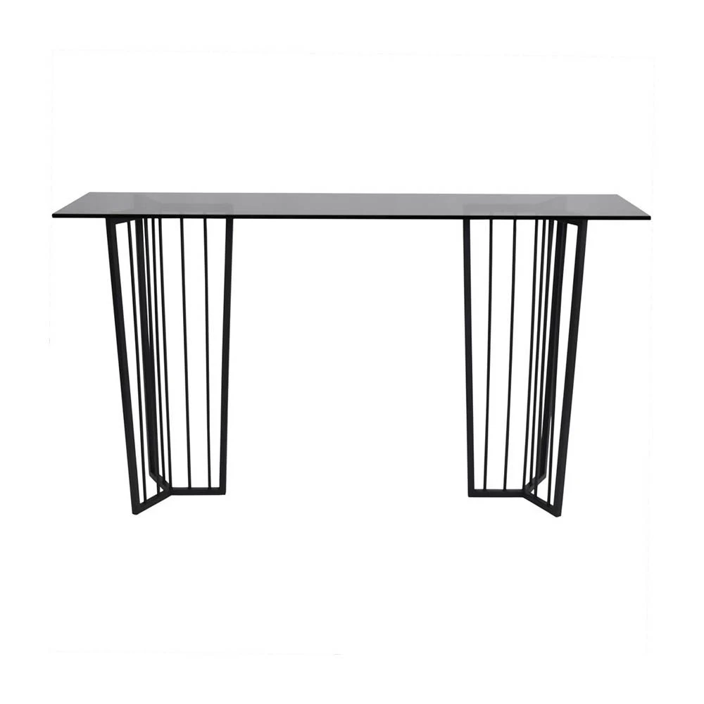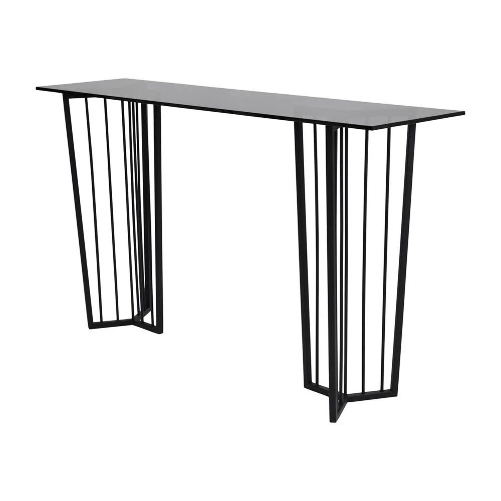 Give your space an industrial-inspired look with the Trina Glass Console Table, crafted out of matte black powder coated metal and tinted glass. Featuring geometric-shaped legs which showcase strong lines and a rectangular top, this piece brings understated elegance and charm to any space.