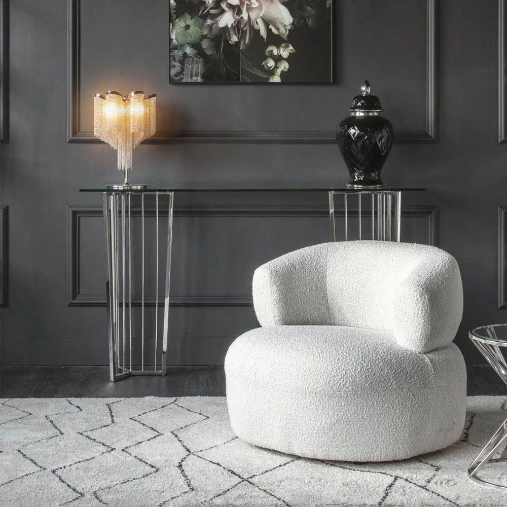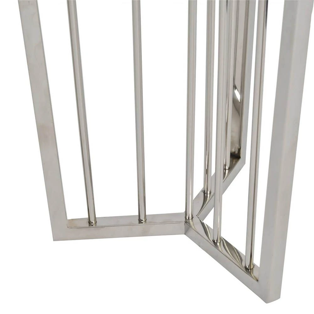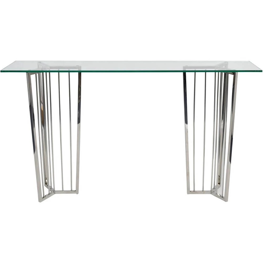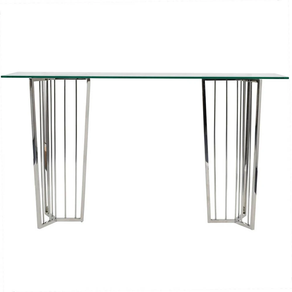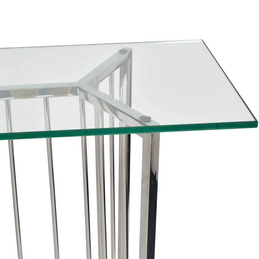 Give your space an industrial-inspired look with the Trina Glass Console Table, crafted out of stainless steel and clear glass. Featuring geometric-shaped legs which showcase strong lines and a rectangular top, this piece brings understated elegance and charm to any space.