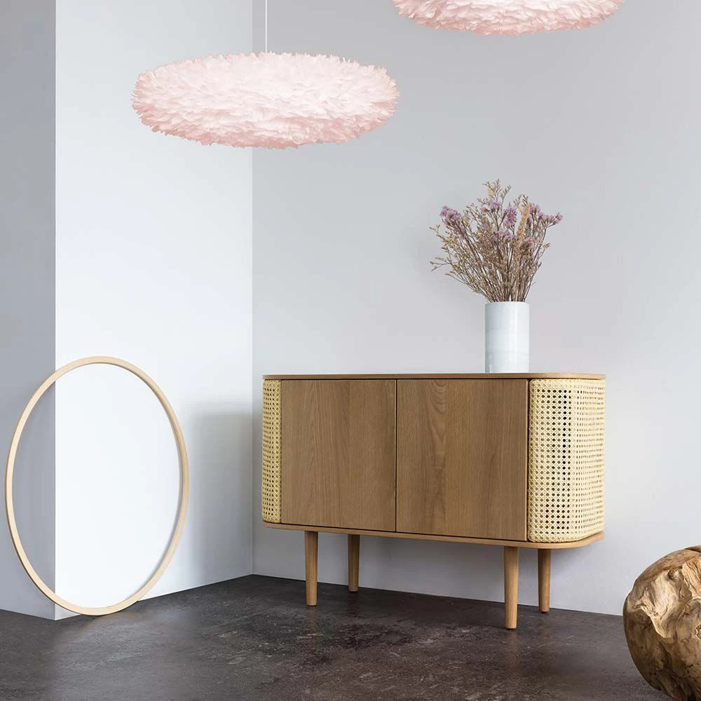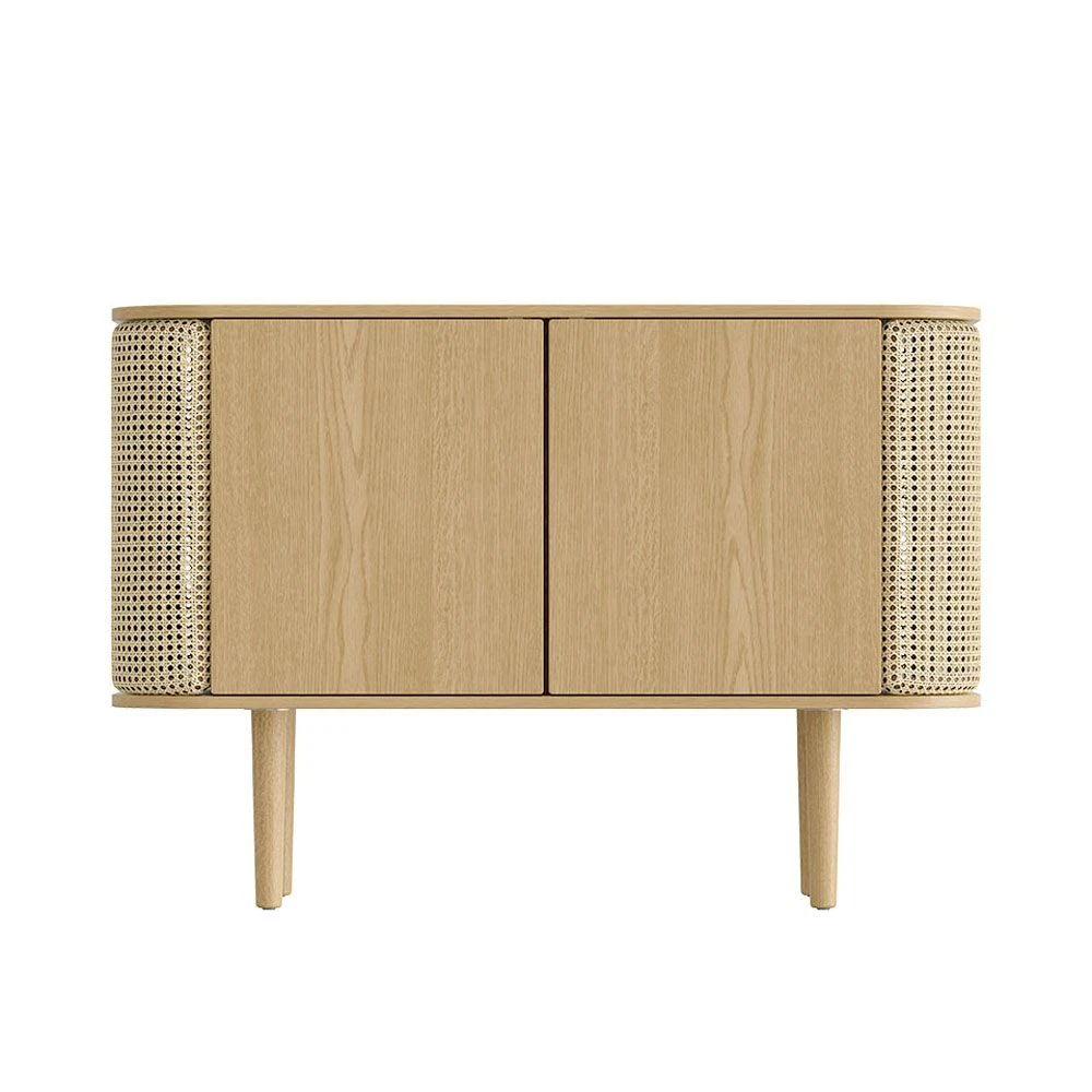 This luxurious Nordic-inspired rattan cabinet comes in a lovely, natural oak and cane finish perfect for completing minimal and Scandinavian-style spaces. Featuring two drawers and interior shelving for storage, this cabinet had stylish, curved sides with a Venetian cane finish.