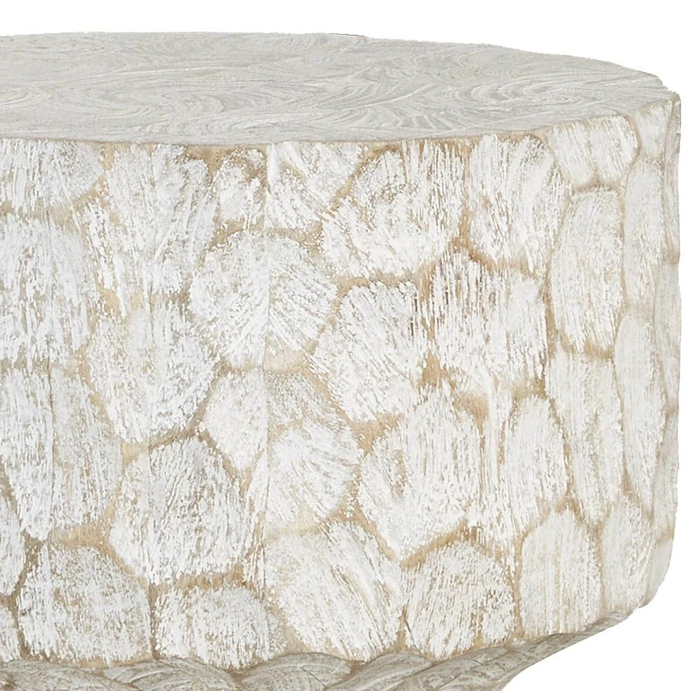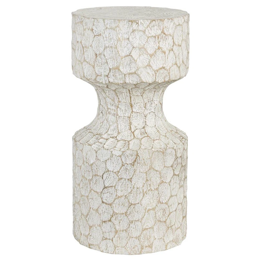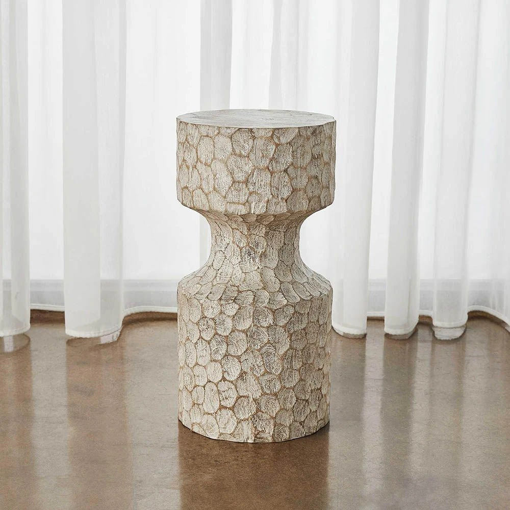 Adore the textured finish of this divine, hand-chiselled accent table. This piece boasts a shapely, corseted silhouette with white-washed circular chisel marks in the solid mango wood, to allow the natural wood tone to show through for a mesmerising and artistic appeal.